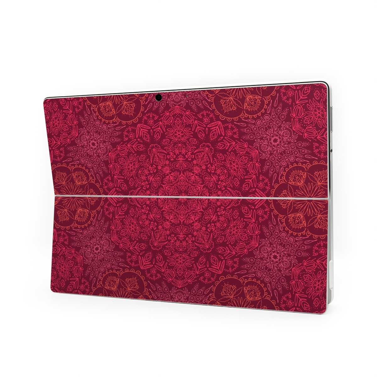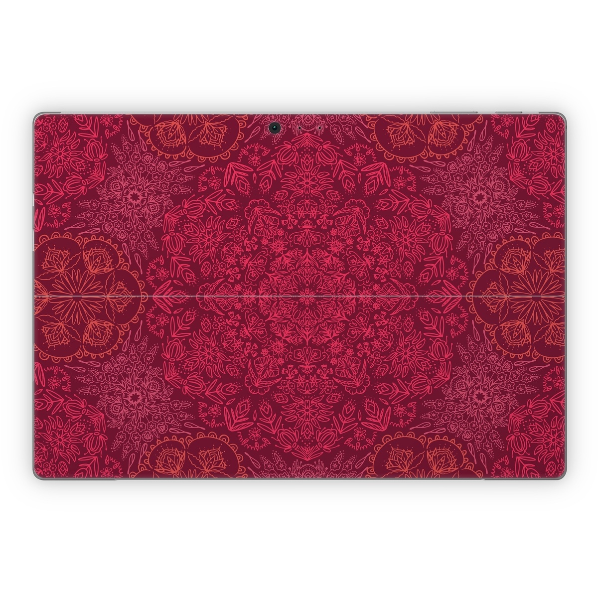 iStyles Microsoft Surface Pro Series Skin design of Red, Pattern, Pink, Magenta, Purple, Maroon, Violet, Textile, Design, Wallpaper, with red, black colors, and tagged with patterns, flowers, lookslike, floral, flowers, mandala, red, tapestry.