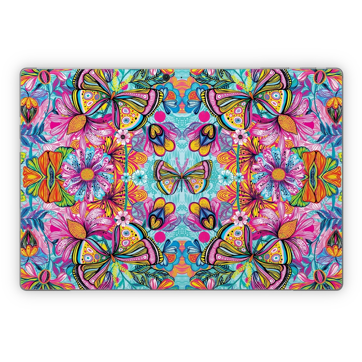 iStyles Microsoft Surface Pro Series Skin design of Pattern, Design, Textile, Psychedelic art, Visual arts, Symmetry, Art, Motif, with blue, pink, green, yellow, orange, purple colors, and tagged with patterns, flowers, animals, bright, butterfly, carpintos, colorful, flowers, pastels, pattern, spring, summer.