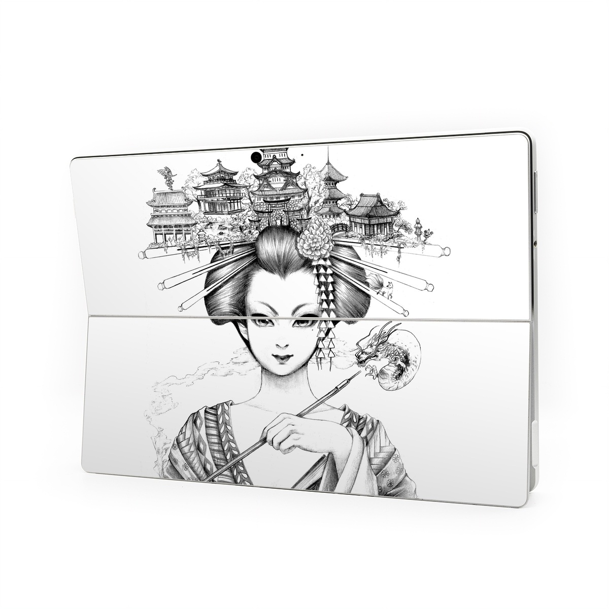 iStyles Microsoft Surface Pro Series Skin design of Illustration, Head, Hairstyle, Line art, Art, Fashion illustration, Drawing, Coloring book, Black-and-white, Clip art, with black, white, gray colors, and tagged with people, fineart, urban, flowers, objects, animals, blackandwhite, drawn, geisha, geishagirl, handdrawn, sketch.