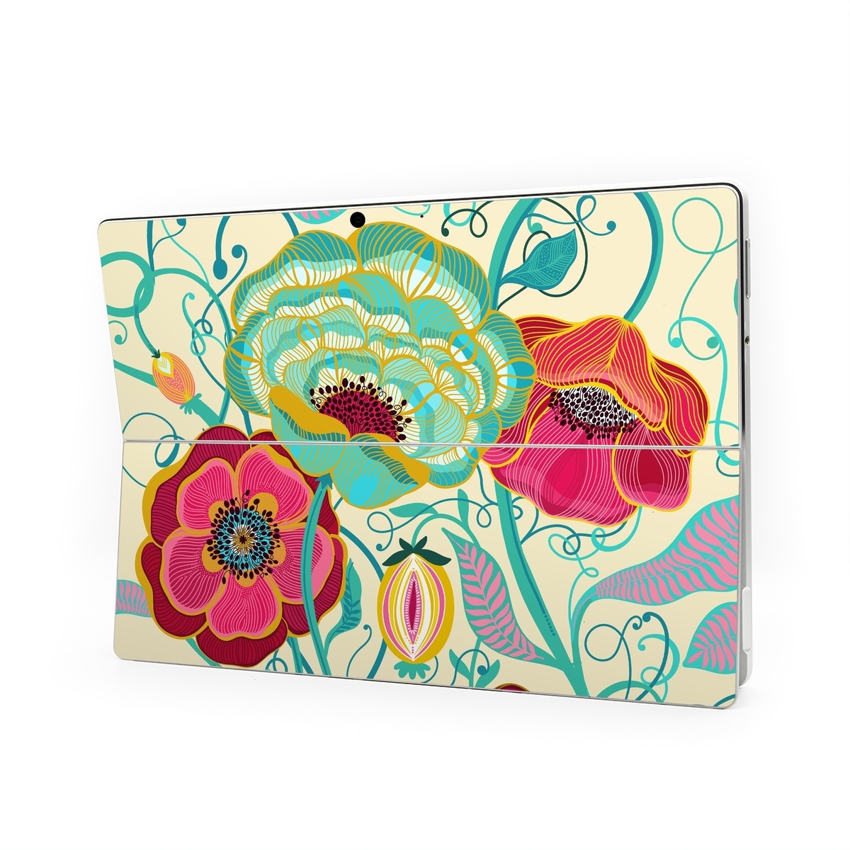 iStyles Microsoft Surface Pro Series Skin design of Plant, Botany, Textile, Pink, Creative arts, Petal, Magenta, Art, Pattern, Rectangle, with white, red, pink, yellow, green, blue, black colors, and tagged with patterns, flowers, flowers, garden, vine.