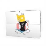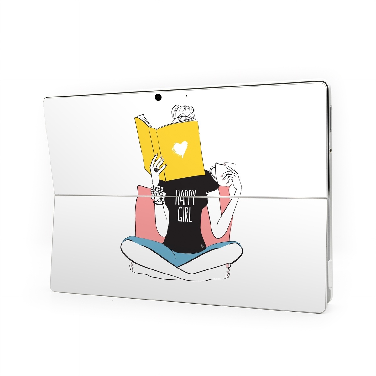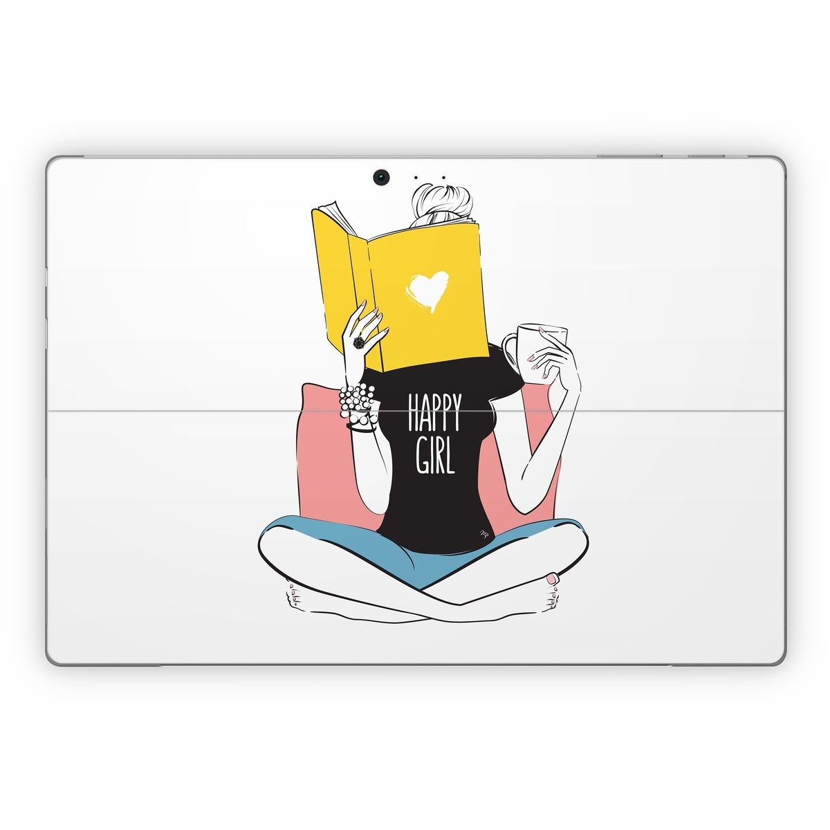 iStyles Microsoft Surface Pro Series Skin design of White, Sleeve, Gesture, Cartoon, Comfort, Elbow, Font, Graphics, Knee, Art, with white, black, blue, pink, yellow colors, and tagged with objects, people, signs, hearts, reading, happy, cup, coffee, girl.