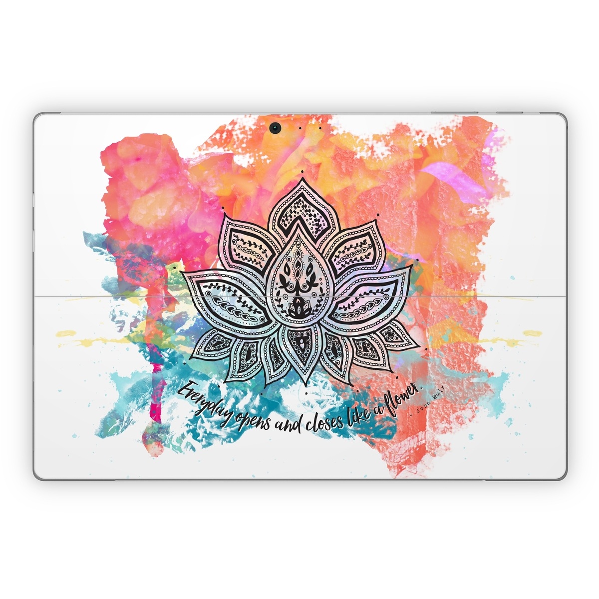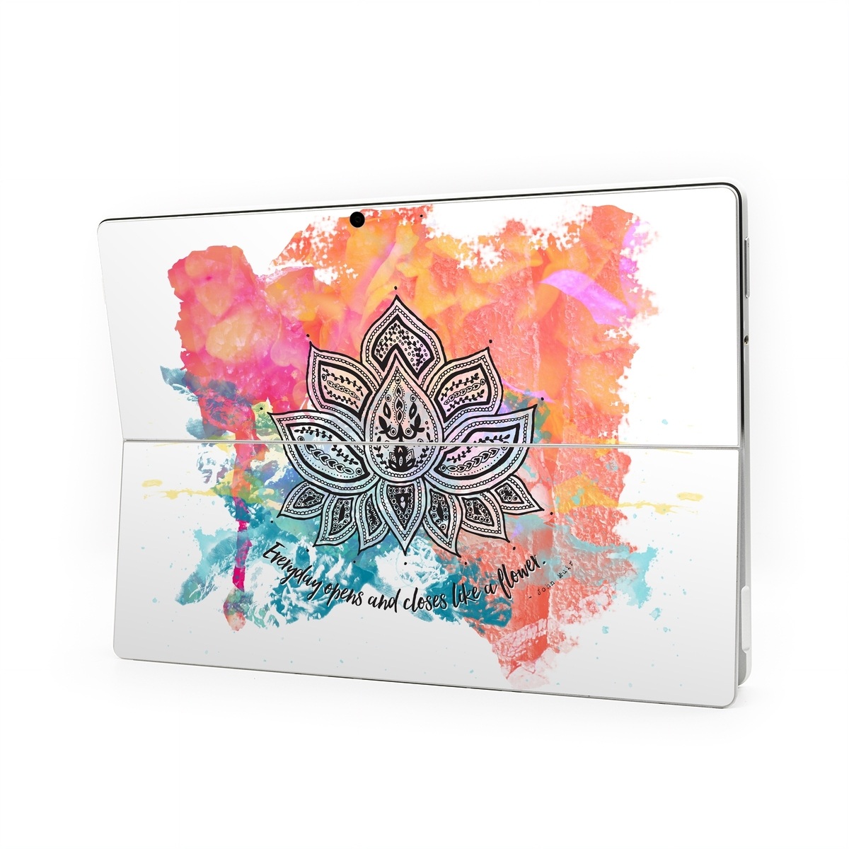 iStyles Microsoft Surface Pro Series Skin design of Pink, Leaf, Pattern, Design, Graphic design, Illustration, Symmetry, Visual arts, Art, Plant, with orange, yellow, red, blue, green, black colors, and tagged with signs, flowers, colorful, flower, lotus.