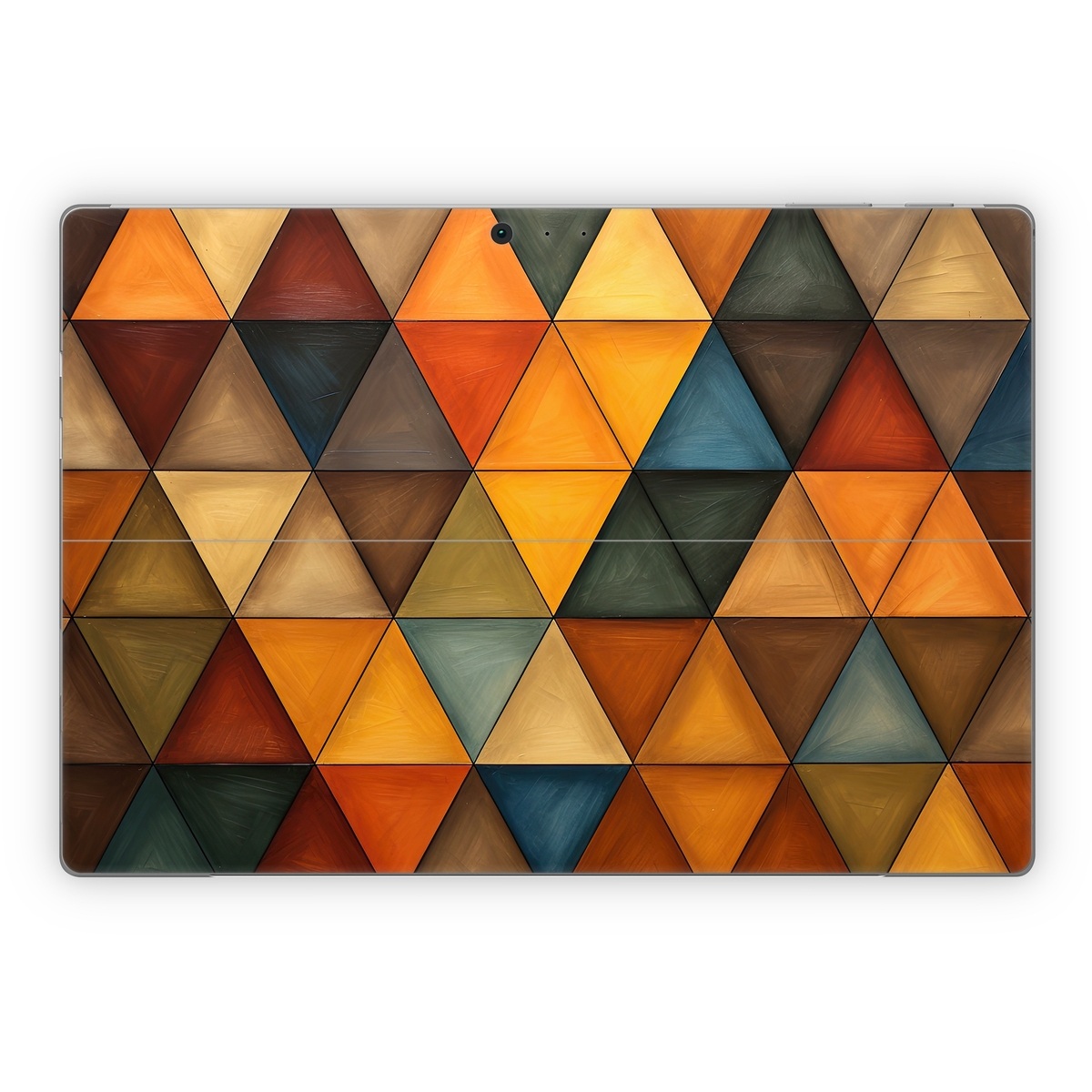 iStyles Microsoft Surface Pro Series Skin design of Brown, Colorfulness, Rectangle, Azure, Amber, Orange, Triangle, Art, Flooring, Line, with yellow, orange, red, black, blue, brown colors, and tagged with patterns, autumn, fall, pattern, triangles.