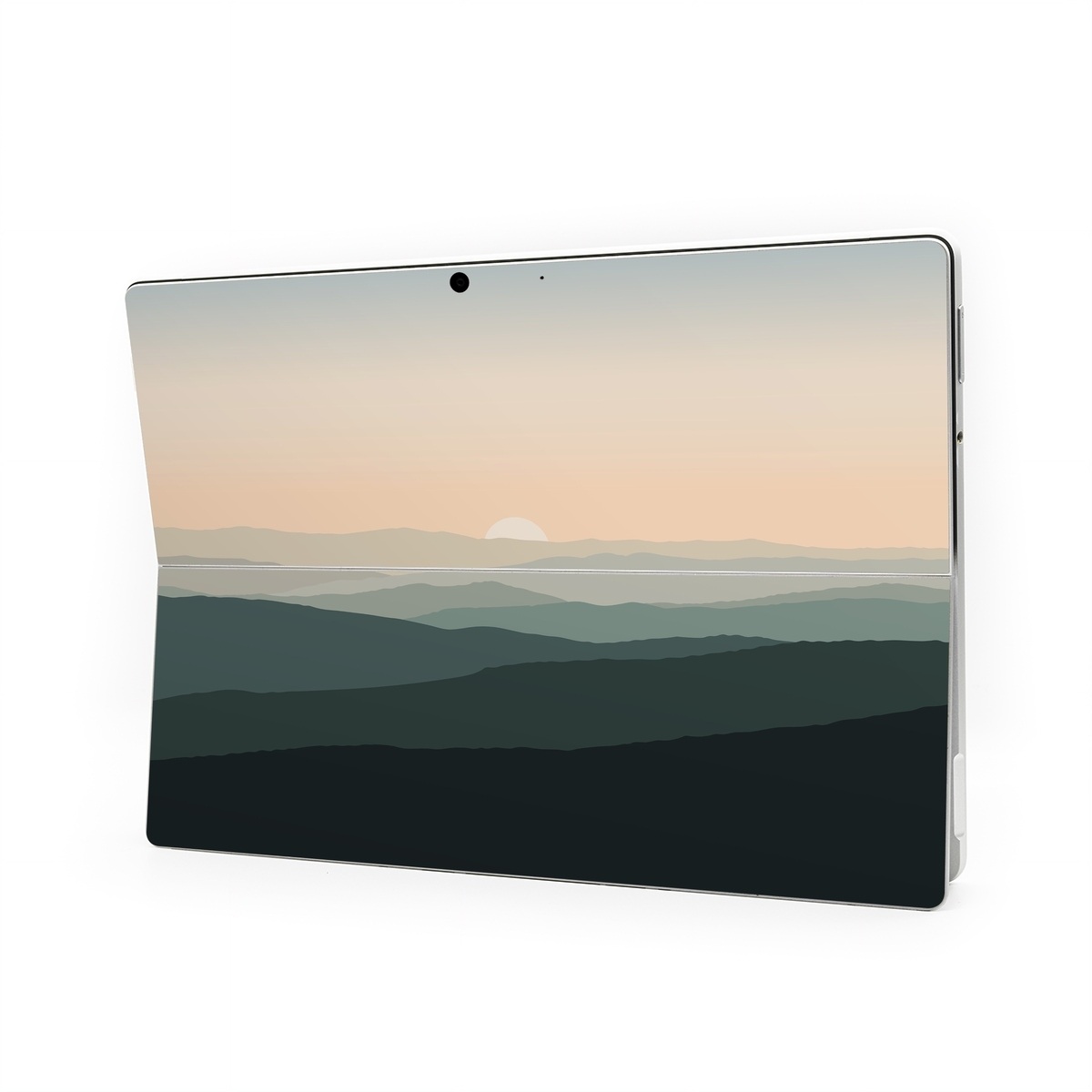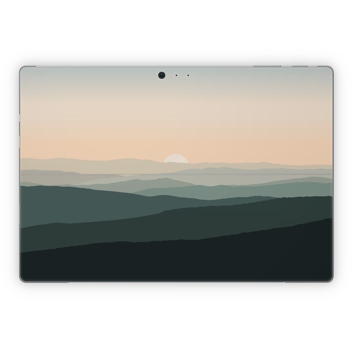 iStyles Microsoft Surface Pro Series Skin design of Sky, Mountain, Afterglow, Cloud, Highland, Dusk, Sunrise, Landscape, Sunset, Cumulus, with black, gray, white, orange, yellow colors, and tagged with nature, sunset, landscape, mountains, horizon.