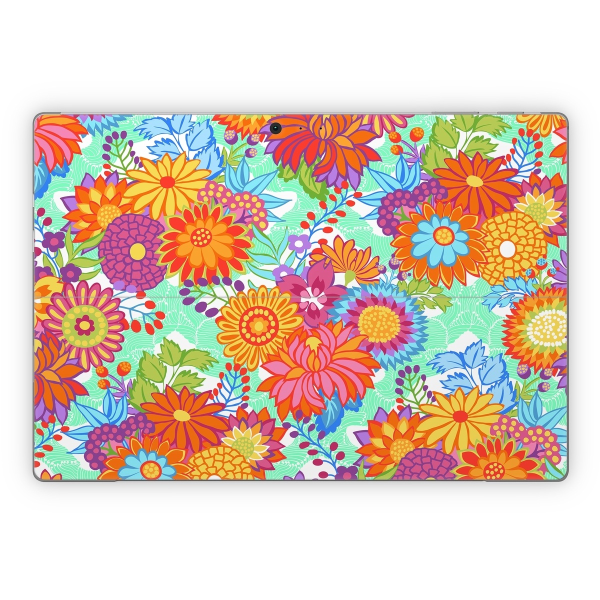 iStyles Microsoft Surface Pro Series Skin design of Pattern, Floral design, Orange, Flower, Design, Textile, Plant, Wildflower, Wrapping paper, Visual arts, with gray, orange, green, purple colors, and tagged with patterns, flowers, bright, carnival, floral, flowers, fuchsia, green, orange, pattern, pink, yellow.