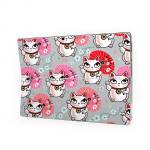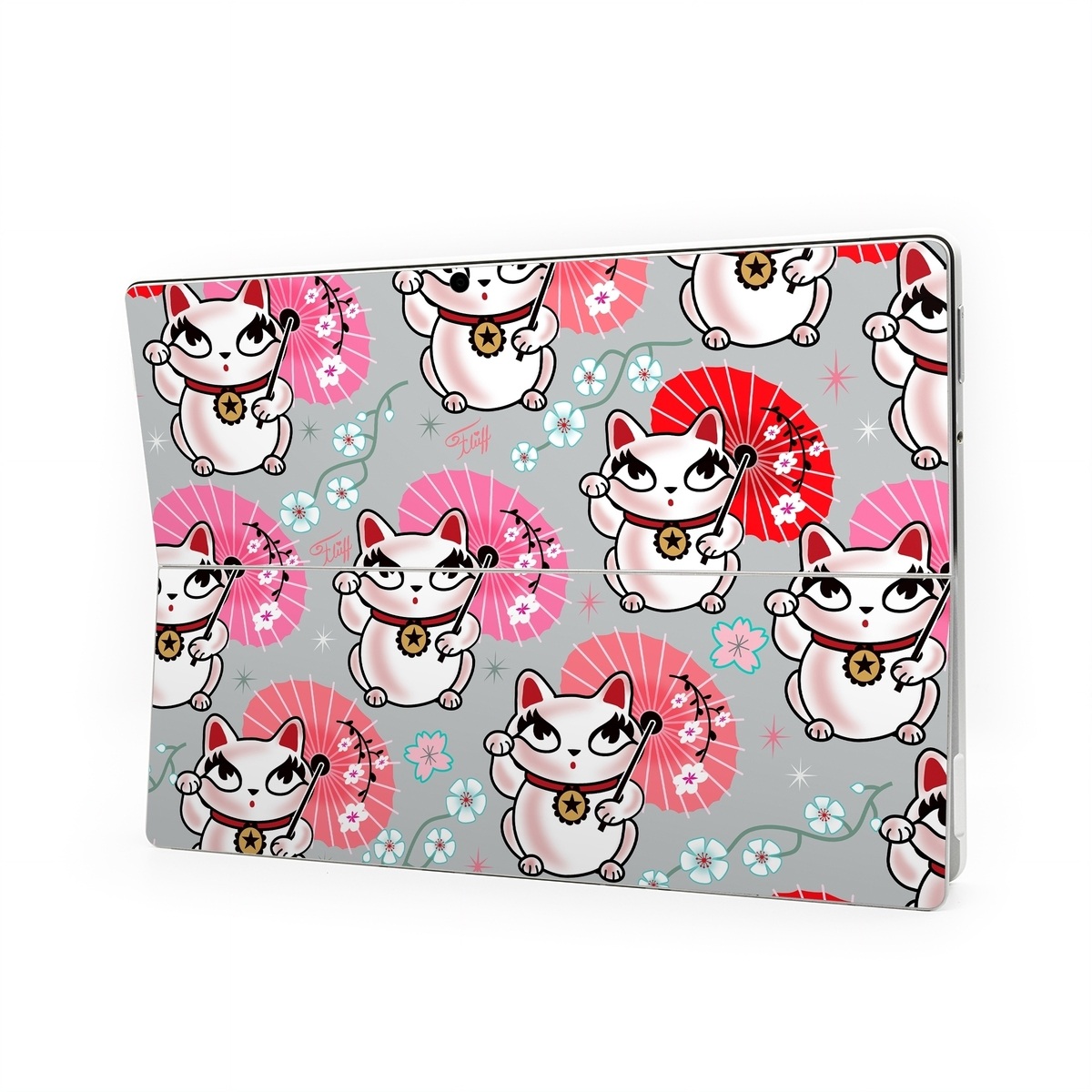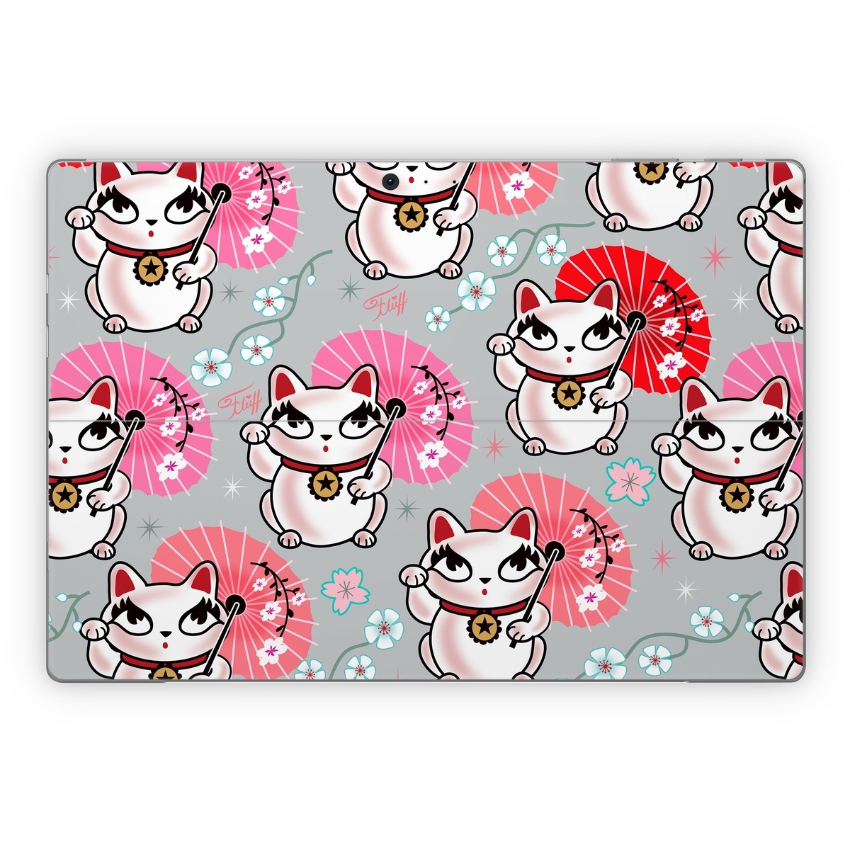 iStyles Microsoft Surface Pro Series Skin design of Pink, Red, Cartoon, Design, Line, Textile, Pattern, Illustration, Smile, Fictional character, with white, red, pink, gray, blue, black colors, and tagged with patterns, animals, objects, cat, cats, fantasy, flower, flowers, grey, pink.