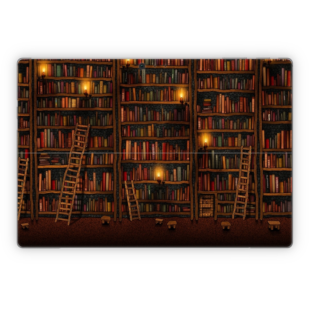 iStyles Microsoft Surface Pro Series Skin design of Shelving, Library, Bookcase, Shelf, Furniture, Book, Building, Publication, Room, Darkness, with black, red colors, and tagged with fineart, objects.