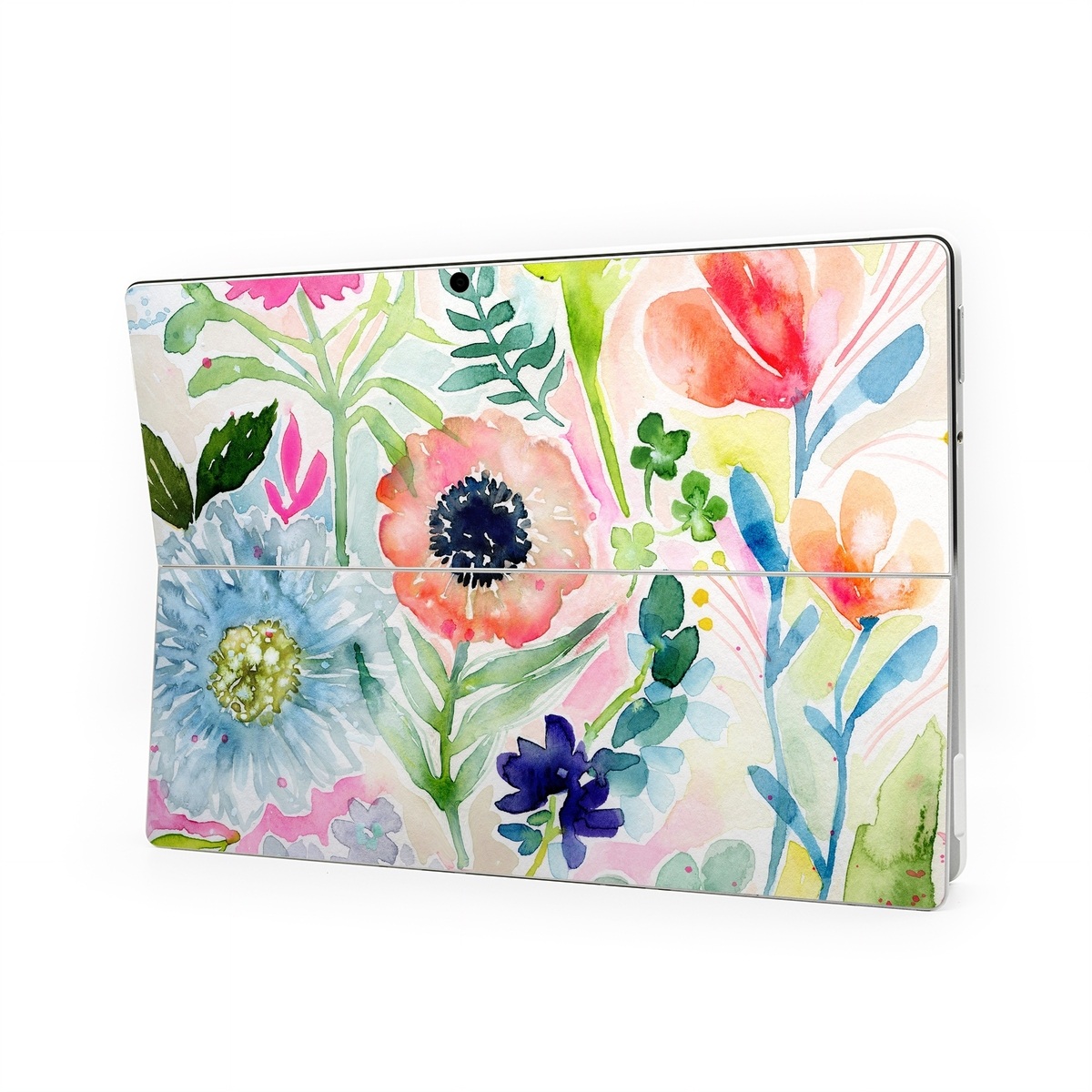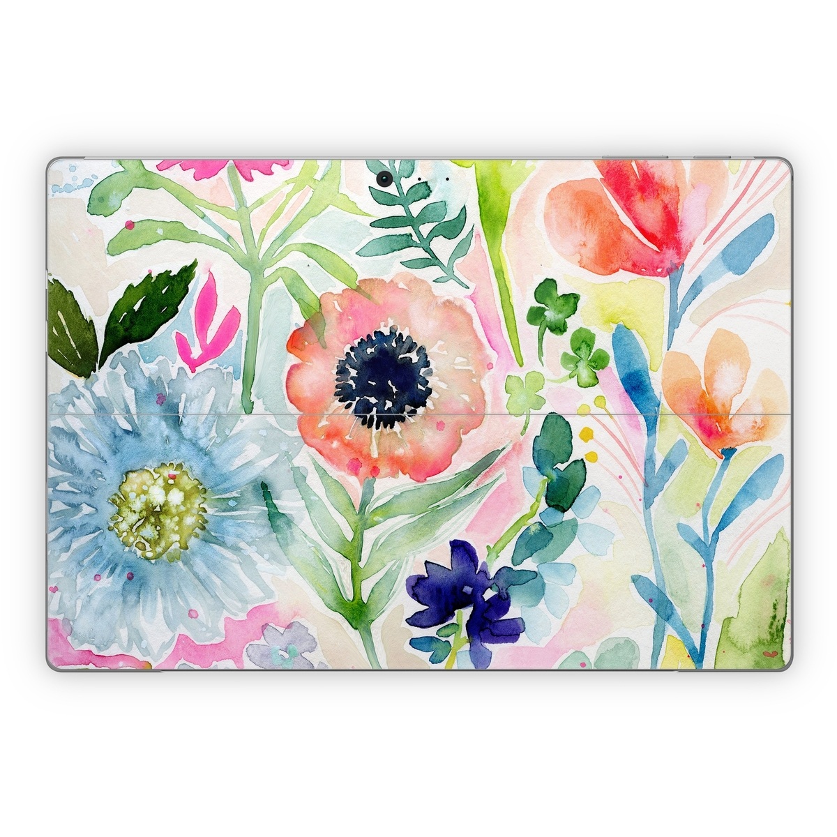iStyles Microsoft Surface Pro Series Skin design of Flower, Watercolor paint, Plant, Flowering plant, Pattern, Floral design, Botany, Petal, Wildflower, Design, with green, pink, yellow, orange, blue, red, purple colors, and tagged with flowers, patterns, floral, flowers, garden, paint, painting, watercolor.