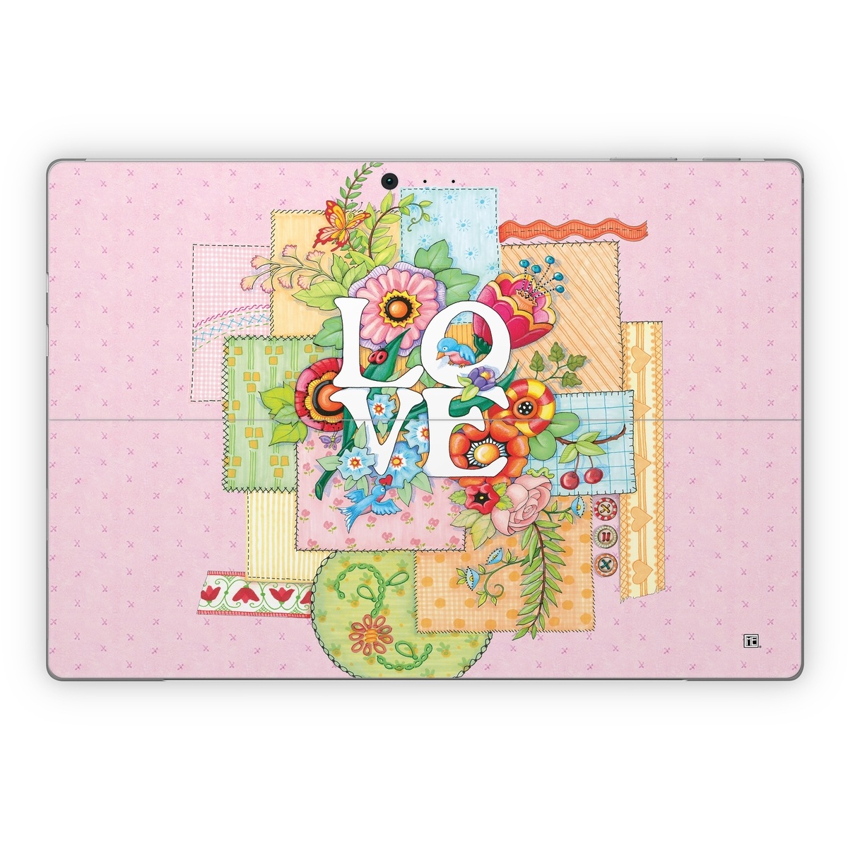 iStyles Microsoft Surface Pro Series Skin design of Illustration, Graphics, Art, with pink, blue, white, orange, yellow, green, red colors, and tagged with signs, flowers, animals, flower, flowers, love, patch, patches, pattern, sew, sewing, stitch, stitches, stitching.