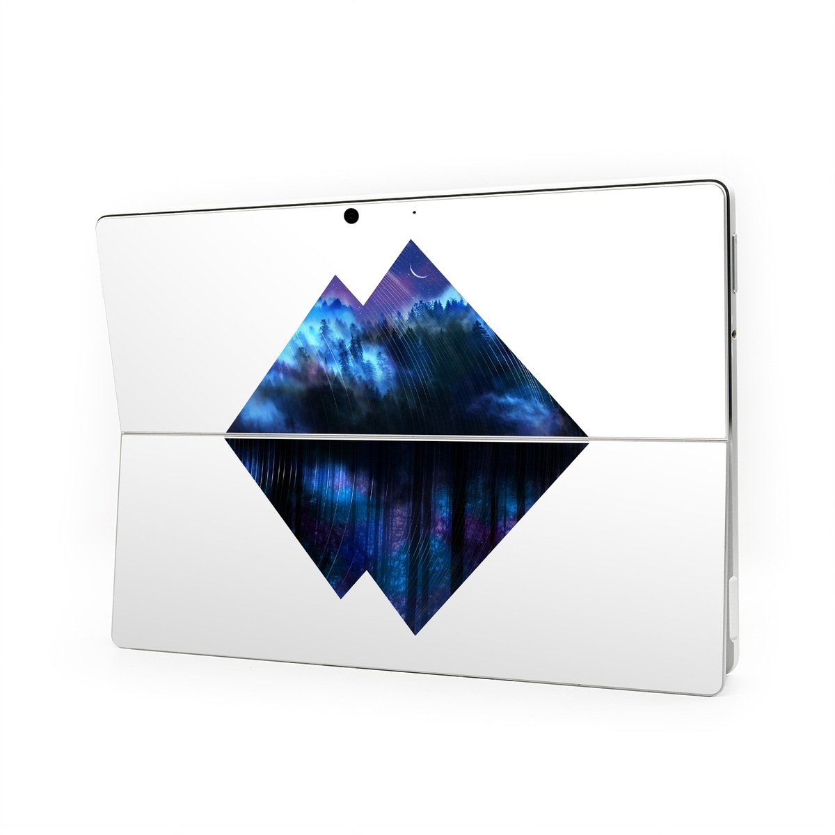 iStyles Microsoft Surface Pro Series Skin design of Blue, Cobalt blue, Pyramid, Pattern, Electric blue, Design, Fractal art, Sky, Triangle, Space, with white, blue, purple, black colors, and tagged with nature, objects, space, signs, earth, geometry, moon, mountains, nature, plants, space, stars, trees, water.