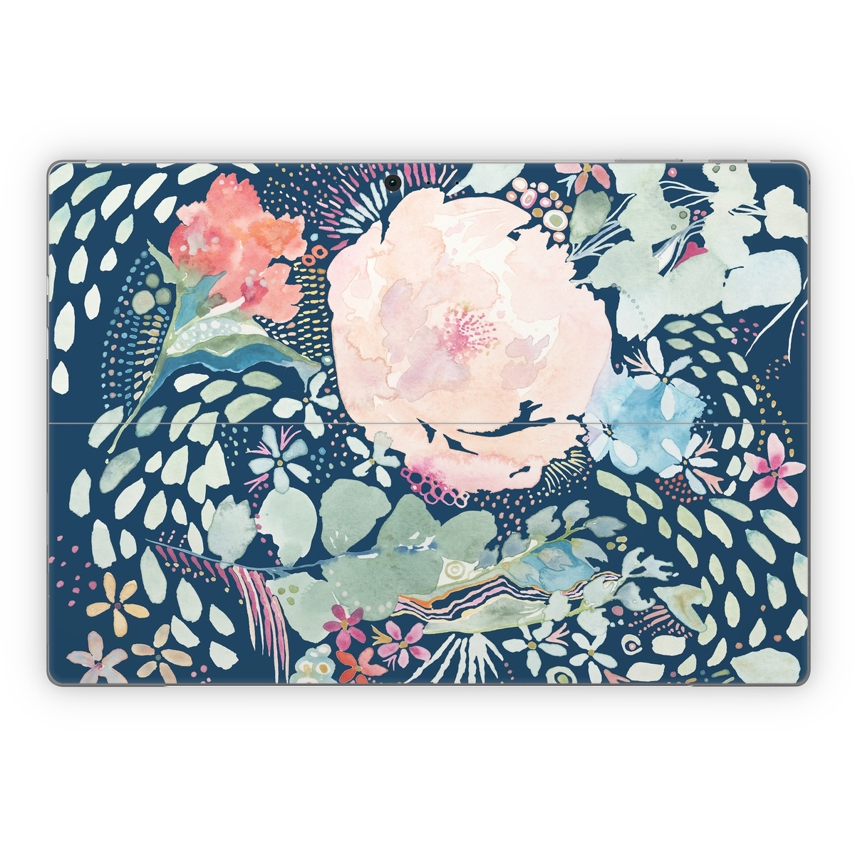 iStyles Microsoft Surface Pro Series Skin design of Flower, Plant, Petal, Botany, Textile, Sleeve, Creative arts, Art, Painting, Aqua, with blue, pink, green, white, orange, yellow, red colors, and tagged with patterns, flowers, blue, bouquet, floral, flower, flowers, garden, leaves, paint, painting, pink, sketch, watercolor.