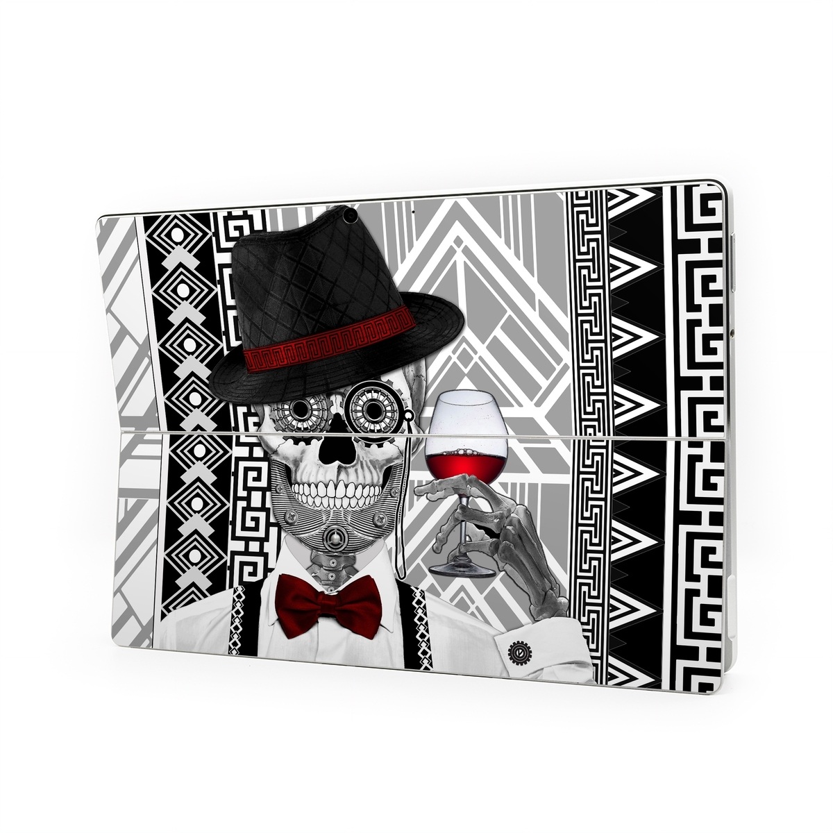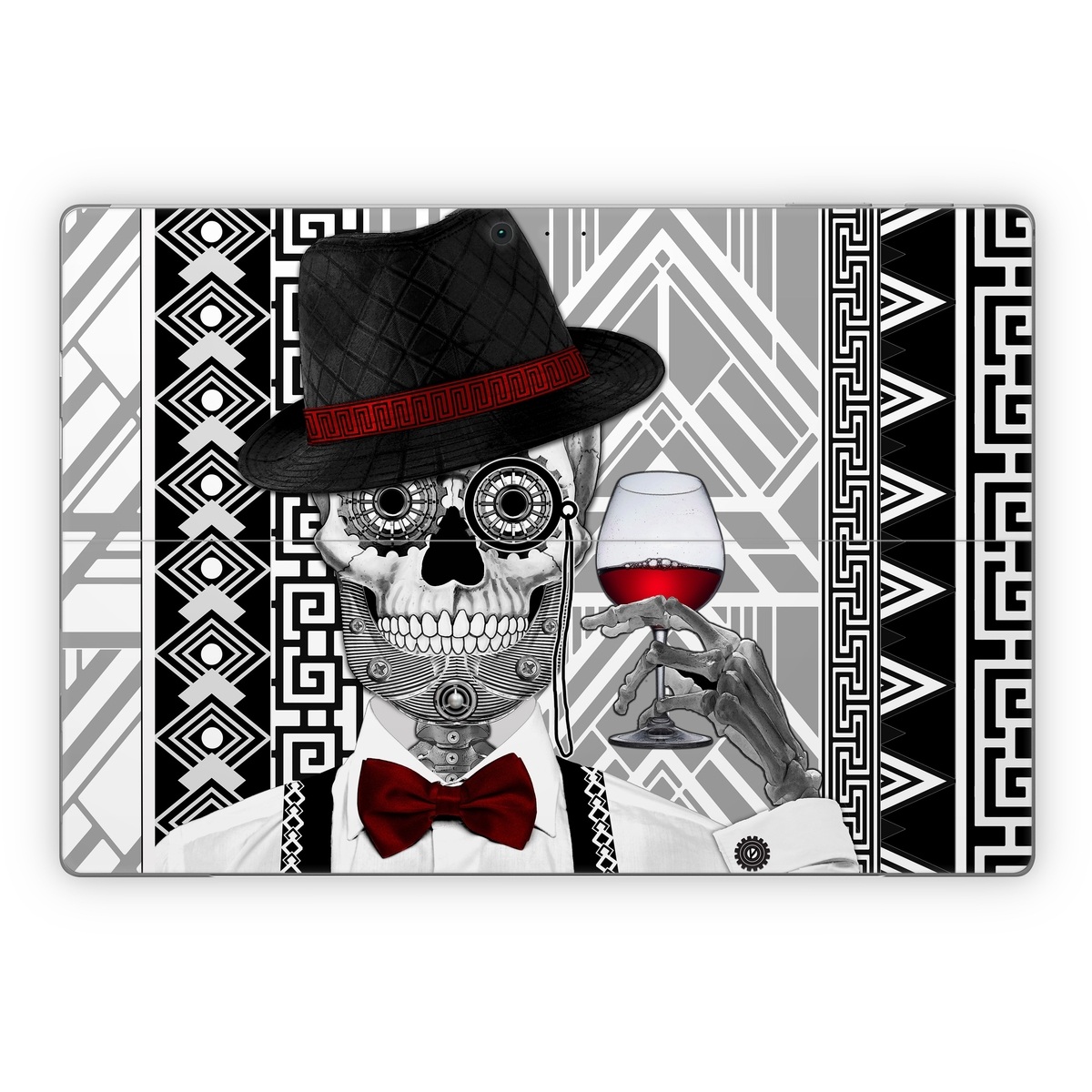 iStyles Microsoft Surface Pro Series Skin design of Cartoon, Poster, Font, Illustration, Headgear, Games, Photo caption, Fictional character, Graphic design, Hat, with black, white, red colors, and tagged with skulls, objects, patterns, 1920's, artdeco, blackandwhite, calavera, dayofthedead, diadelosmuertos, flapper, greatgatsby, newmexico, pattern, skeleton, skull, sugarskull, vanderbone, wine.