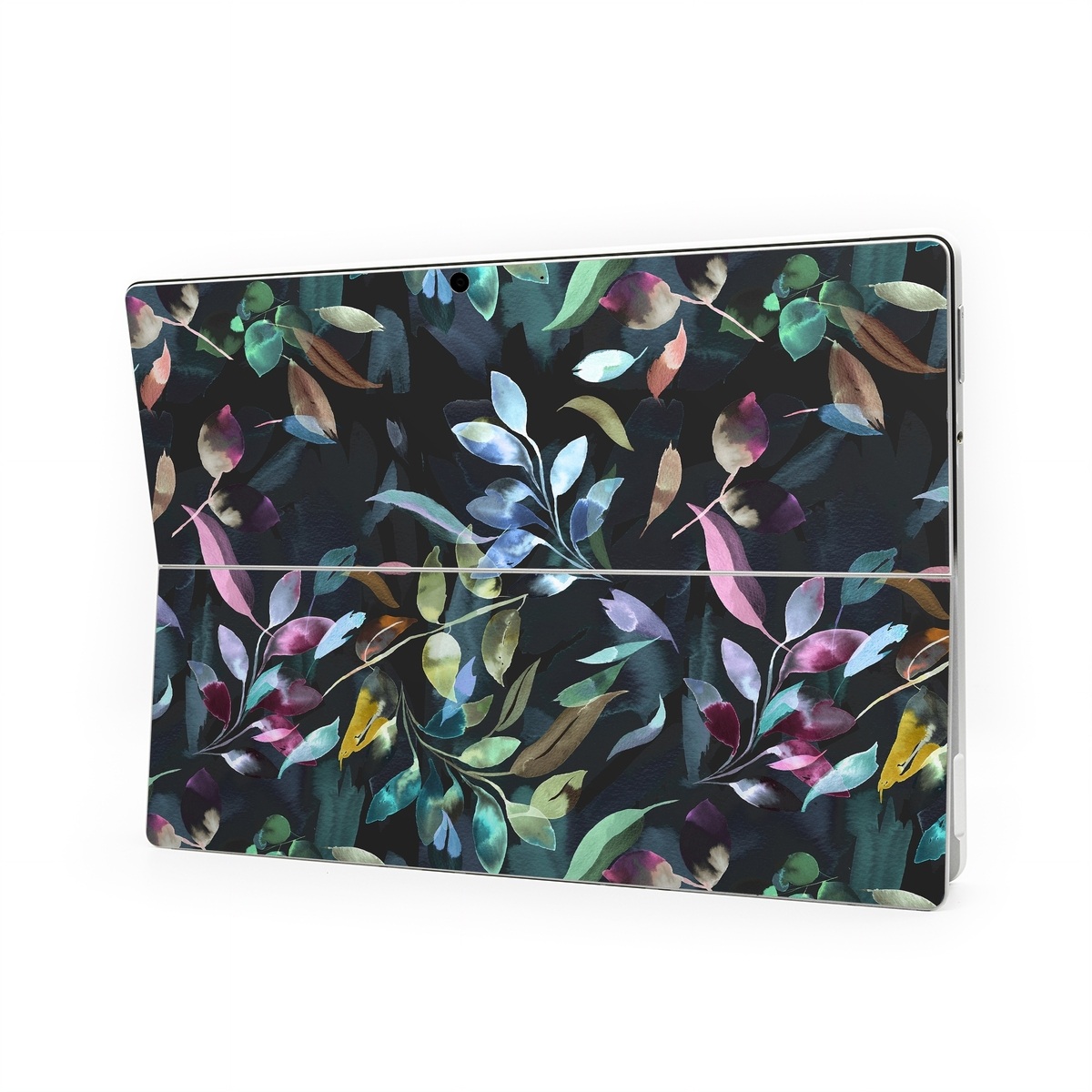 iStyles Microsoft Surface Pro Series Skin design of Flower, Leaf, Plant, Botany, Organism, Line, Art, Petal, Groundcover, Terrestrial plant, with black, blue, green, purple, pink, red, white colors, and tagged with patterns, nature, leaves, fall, pattern.