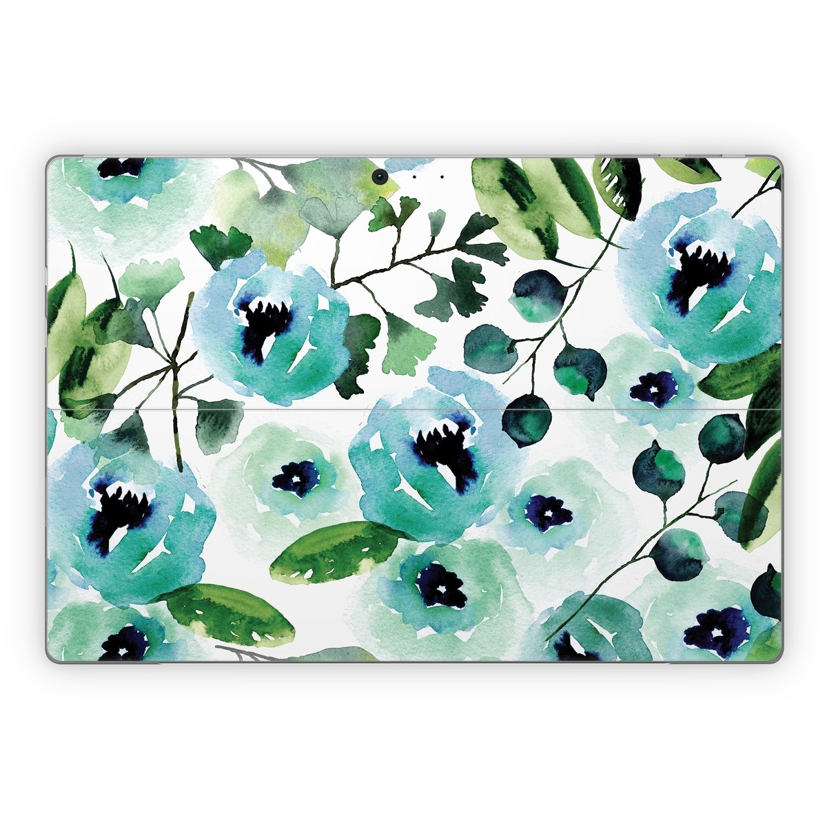 iStyles Microsoft Surface Pro Series Skin design of Green, Pattern, Leaf, Aqua, Plant, Design, Branch, Organism, Flower, Ivy, with white, green, blue, black colors, and tagged with flowers, patterns, floral, flowers, pattern, peonies, sara, saraberrenson, watercolor.
