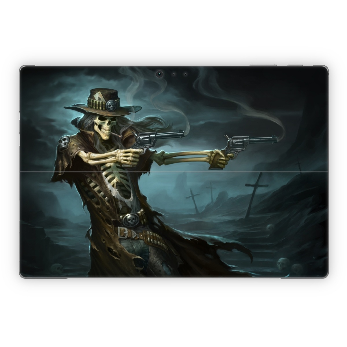 iStyles Microsoft Surface Pro Series Skin design of Cg artwork, Action-adventure game, Darkness, Illustration, Games, Adventure game, Pc game, Woman warrior, Digital compositing, Fictional character, with black, white, blue, gray colors, and tagged with fantasy, skulls, people, bullets, fantasy, gaming, guns, skeleton, skull.
