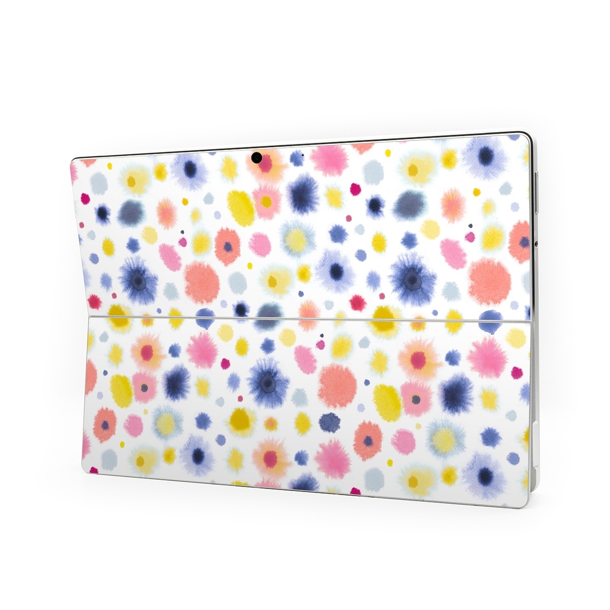 iStyles Microsoft Surface Pro Series Skin design of Material property, Circle, Pattern, Design, Magenta, Electric blue, Font, Flowering plant, Painting, with white, pink, orange, blue, yellow, gray colors, and tagged with patterns, brush, watercolor, splatter.
