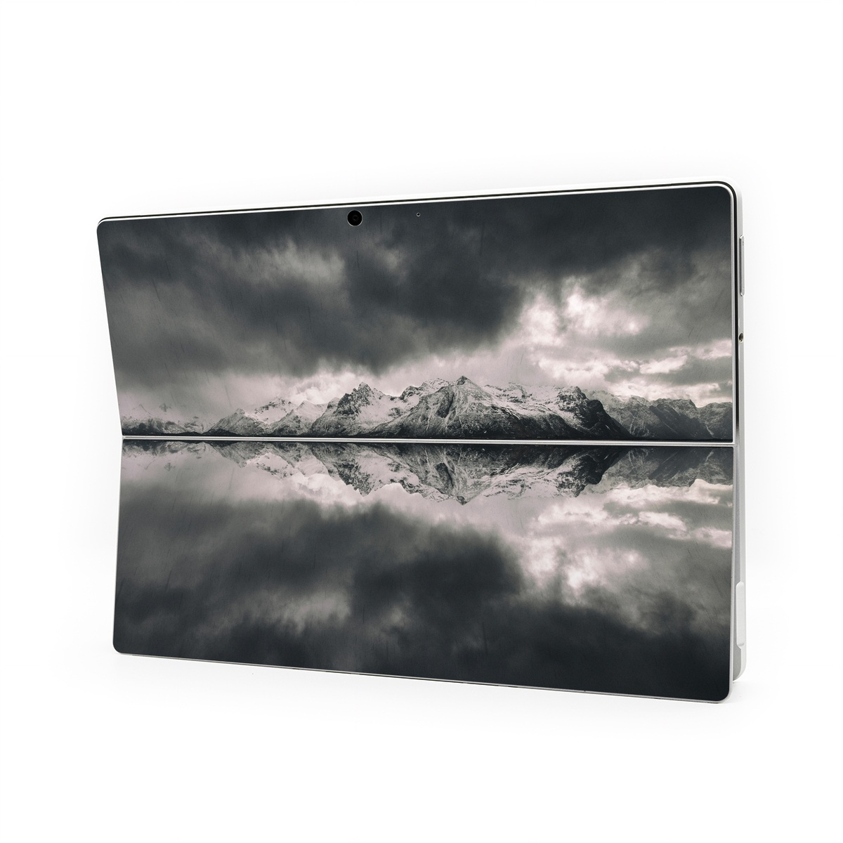iStyles Microsoft Surface Pro Series Skin design of Sky, Cloud, Nature, Reflection, Water, Atmospheric phenomenon, Daytime, Black-and-white, Atmosphere, Calm, with white, black, gray colors, and tagged with nature, photos, dark, lake, landscape, mountains, photo, photography.