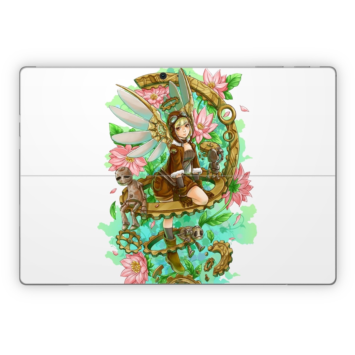iStyles Microsoft Surface Pro Series Skin design of Illustration, Fictional character, Clip art, Art, Graphics, Plant, with white, yellow, pink, green, brown, black colors, and tagged with people, fineart, fantasy, flowers, objects, angel, flowers, gear, gears, girl, pinup, pinupgirl, punk, steampunk, tinker.