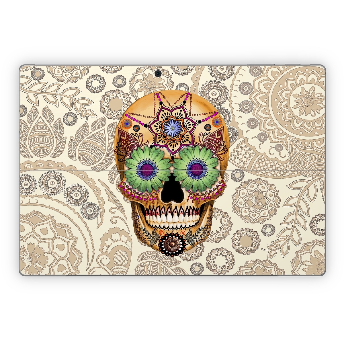 iStyles Microsoft Surface Pro Series Skin design of Skull, Bone, Pattern, Design, Illustration, Visual arts, Fashion accessory, Art, with gray, yellow, green, black, red, pink colors, and tagged with patterns, skulls, flowers, nature.