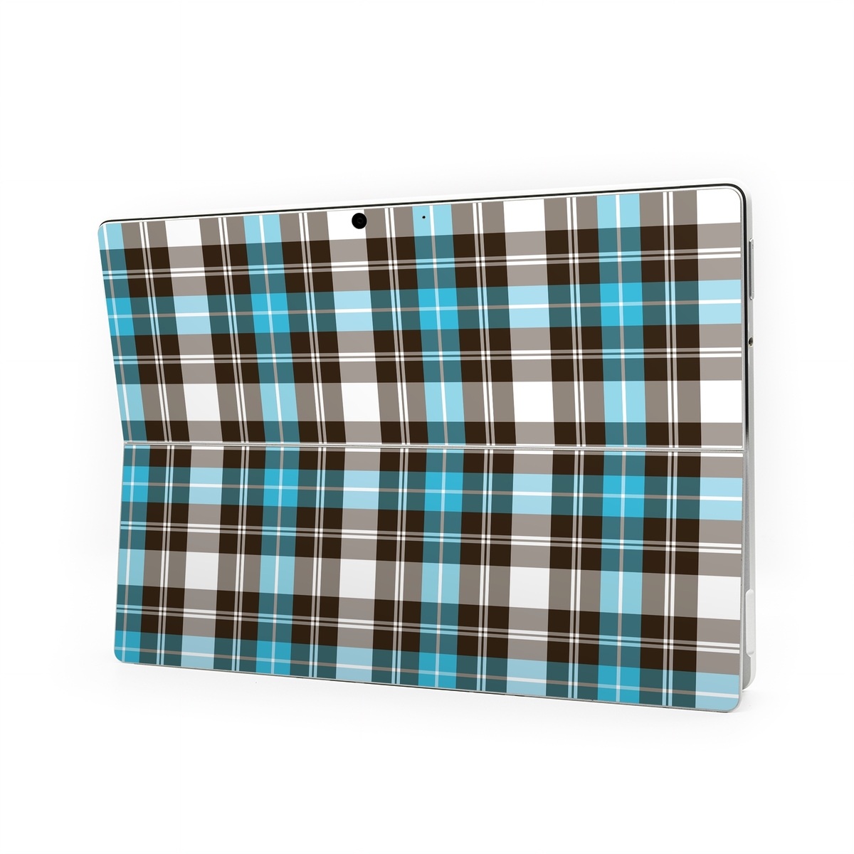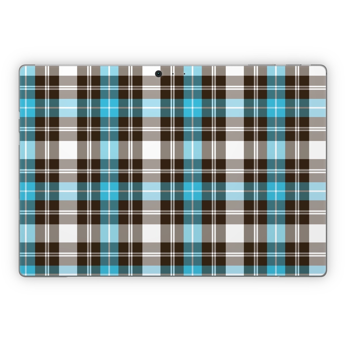 iStyles Microsoft Surface Pro Series Skin design of Plaid, Pattern, Tartan, Turquoise, Textile, Design, Brown, Line, Tints and shades, with gray, black, blue, white colors, and tagged with patterns.