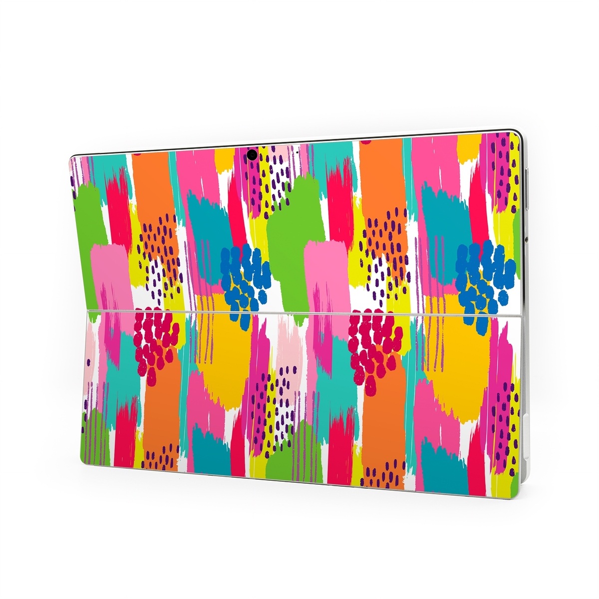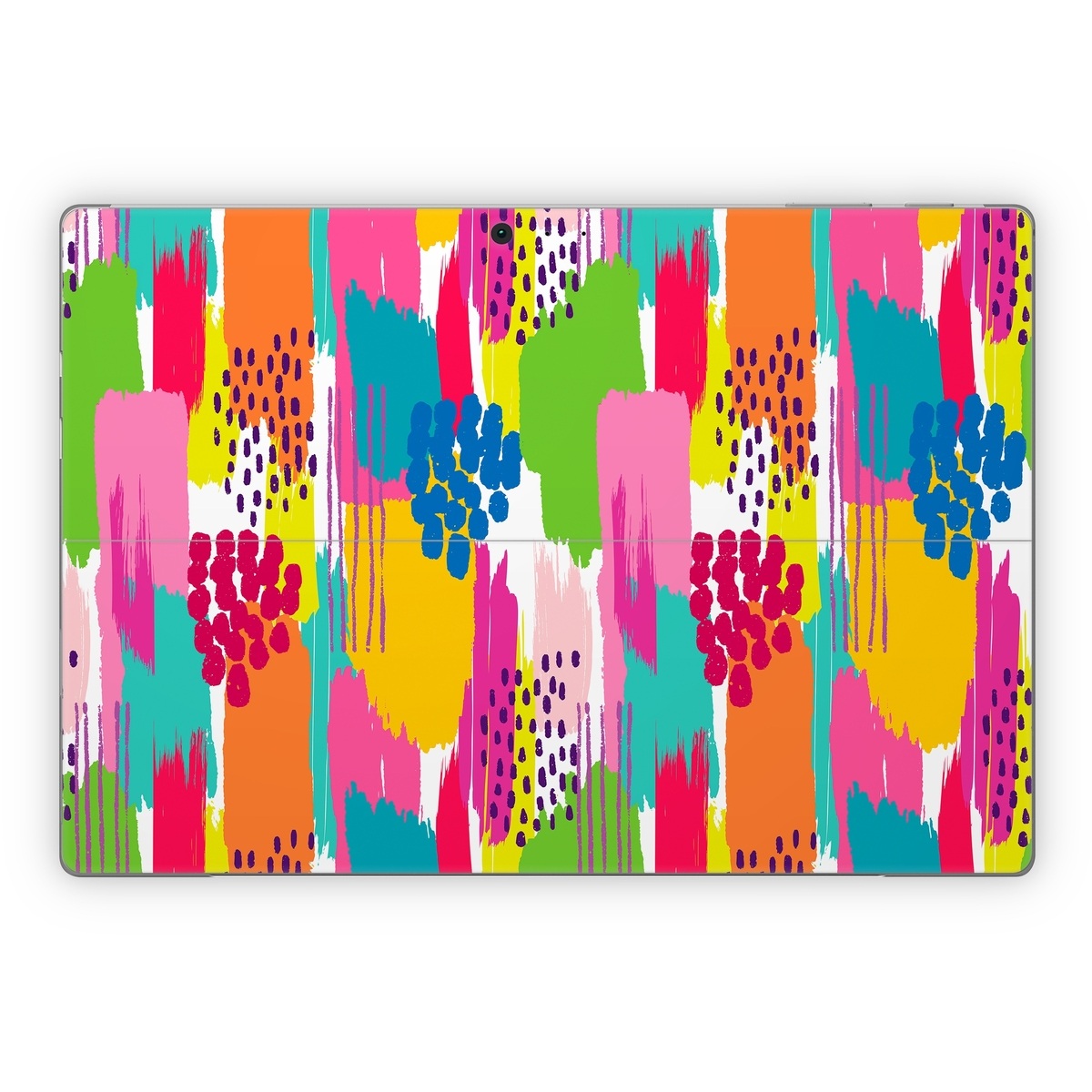 iStyles Microsoft Surface Pro Series Skin design of Colorfulness, Textile, Rectangle, Font, Line, Painting, Art, Magenta, Material property, Pattern, with white, pink, yellow, orange, blue, red colors, and tagged with patterns, abstract, brush, brushstrokes, dots, lines, paint, splatter.