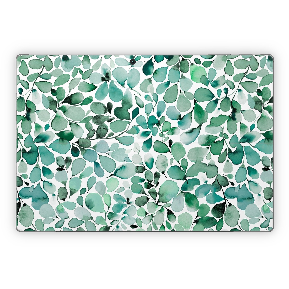 iStyles Microsoft Surface Pro Series Skin design of Azure, Line, Aqua, Pattern, Art, Symmetry, Electric blue, Circle, Creative arts, Terrestrial plant, with white, green, black colors, and tagged with patterns, nature, filigree, garden, green, leaves, nature, paint, painting, teal, turquoise, watercolor.