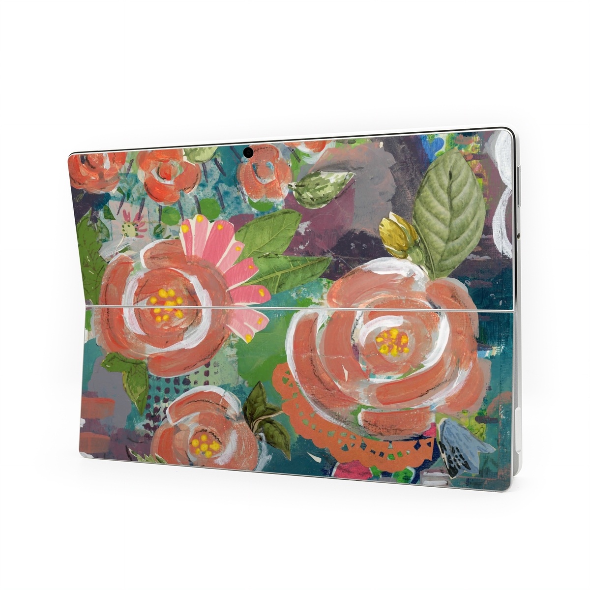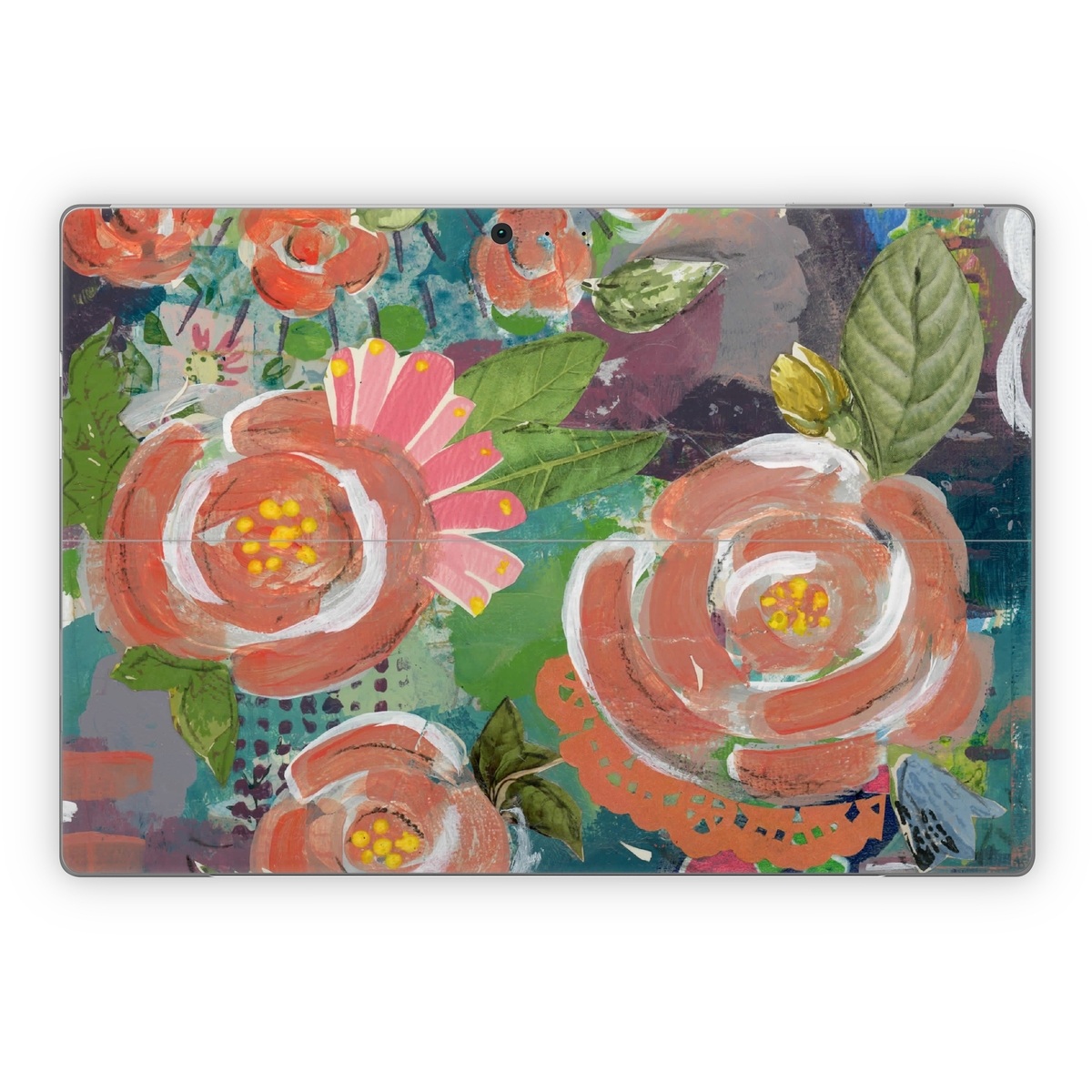 iStyles Microsoft Surface Pro Series Skin design of Painting, Watercolor paint, Still life, Child art, Art, Illustration, Acrylic paint, Flower, Visual arts, Textile, with green, pink, red, yellow, blue, white, black, gray colors, and tagged with flowers, abstract, bright, flowers, nature, paint.