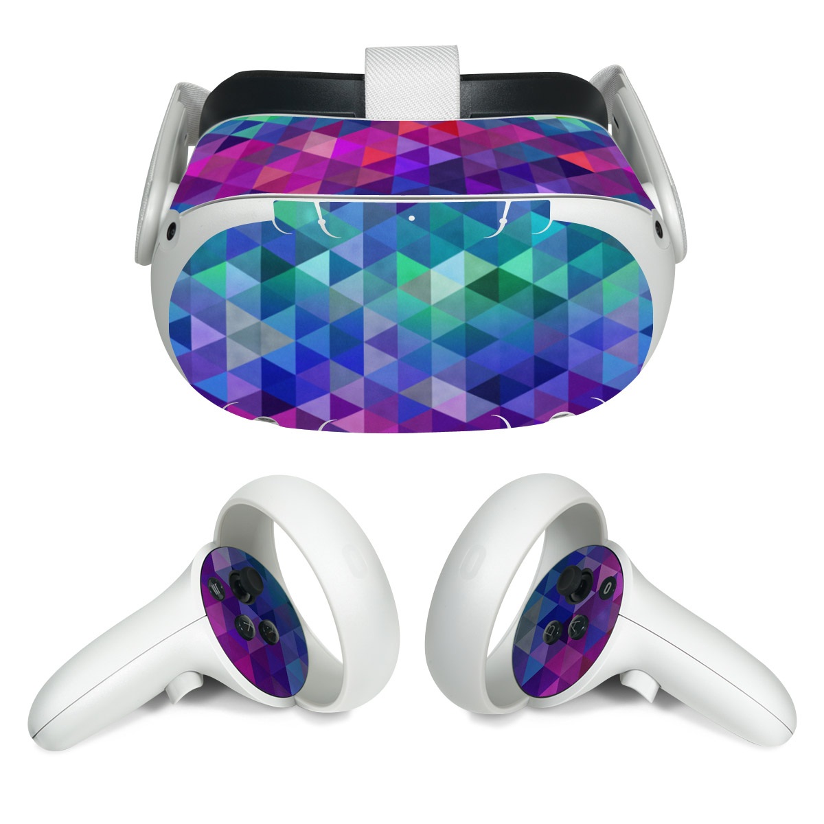 iStyles Meta Quest 2 Skin design of Purple, Violet, Pattern, Blue, Magenta, Triangle, Line, Design, Graphic design, Symmetry, with blue, purple, green, red, pink colors, and tagged with patterns.