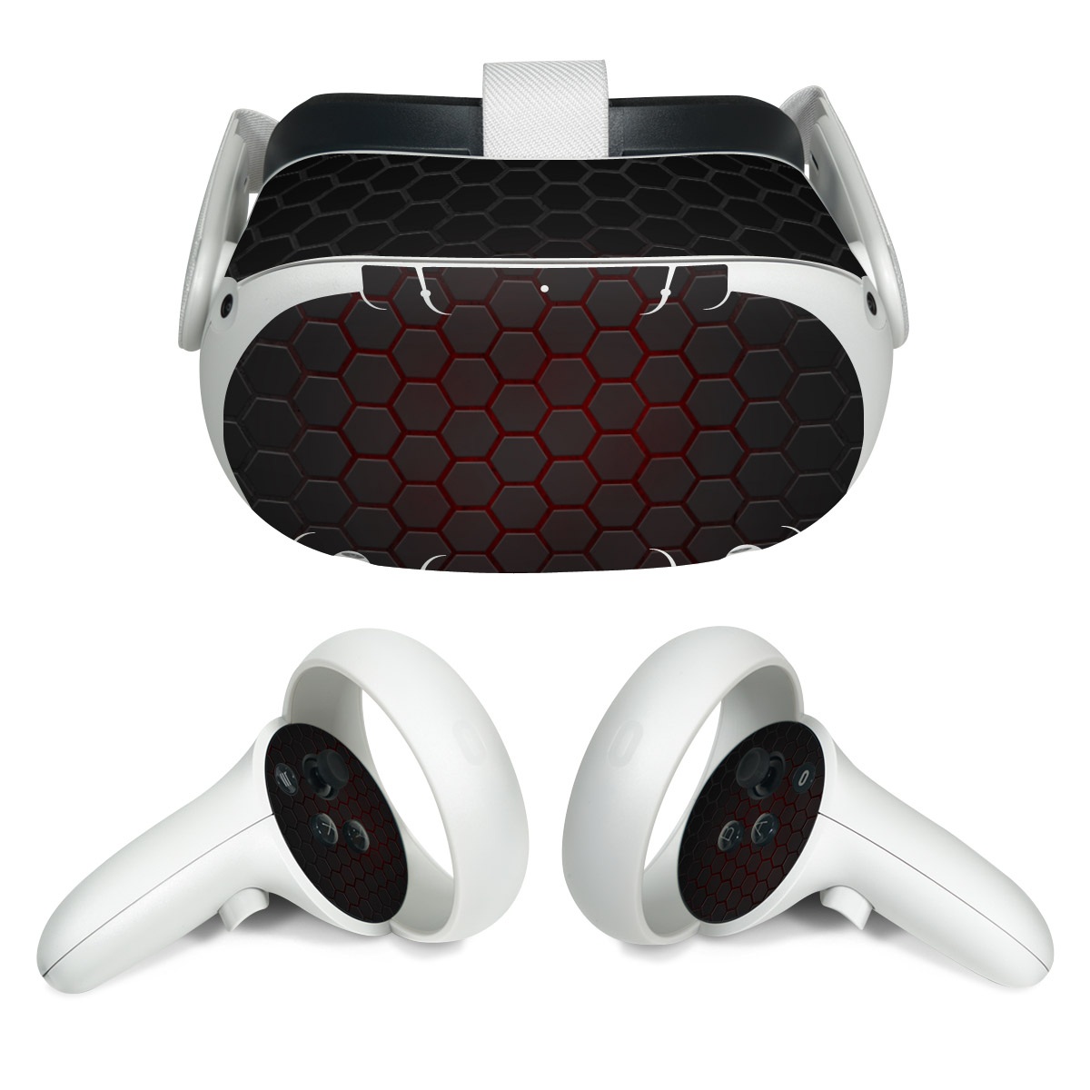 iStyles Meta Quest 2 Skin design of Black, Pattern, Metal, Design, Mesh, Carbon, Space, Wallpaper, with black, red colors, and tagged with lookslike, fantasy, space, drones, geometric, hexagon, tech.
