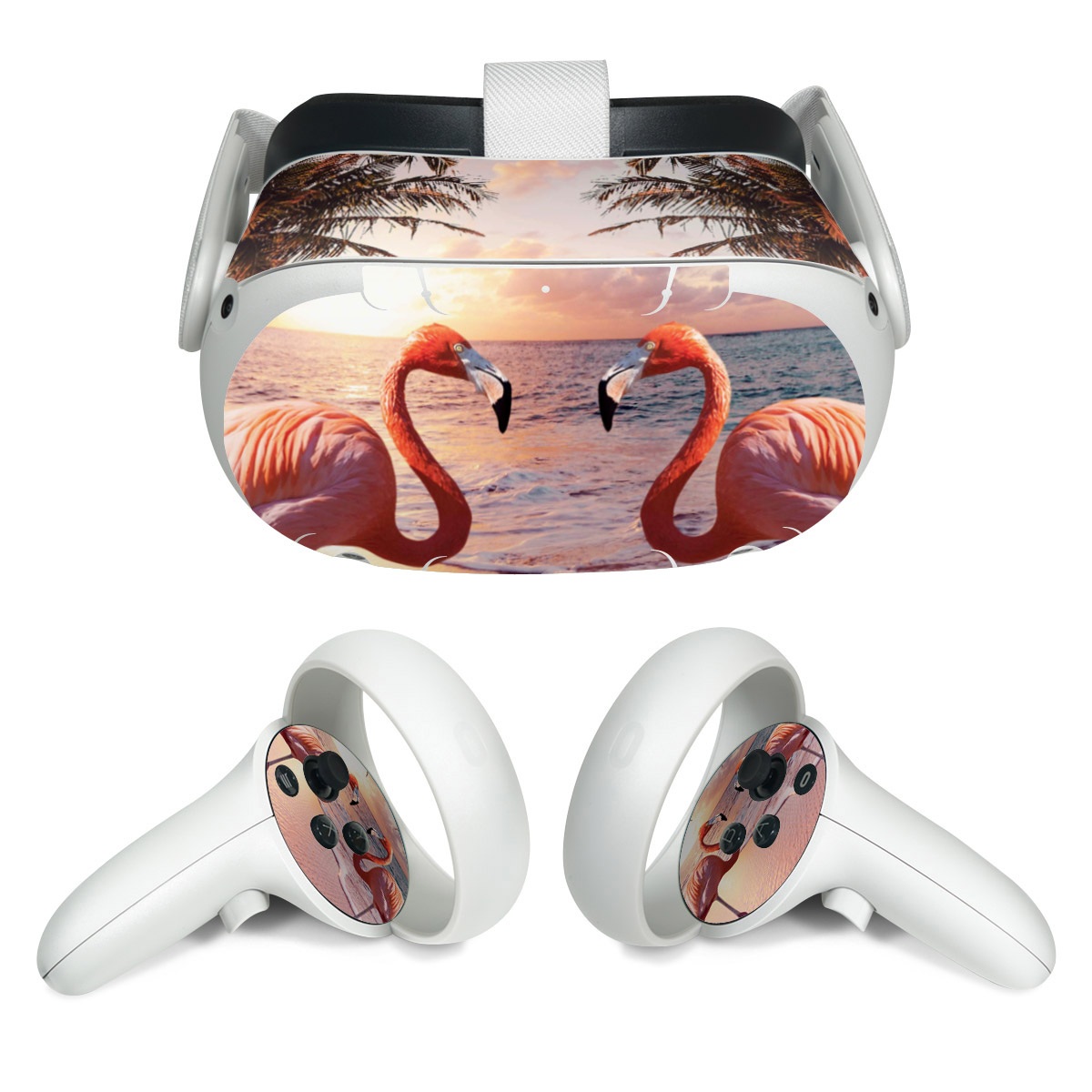 iStyles Meta Quest 2 Skin design of Flamingo, Greater flamingo, Bird, Water bird, Pink, Wildlife, Sky, Tree, Organism, Beak, with pink, blue, green, yellow, white, orange, black colors, and tagged with animals, nature, animal, animals, beach, bird, birds, flamingo, ocean, palm, palmtrees, pink, sunset, tropical, tropics.