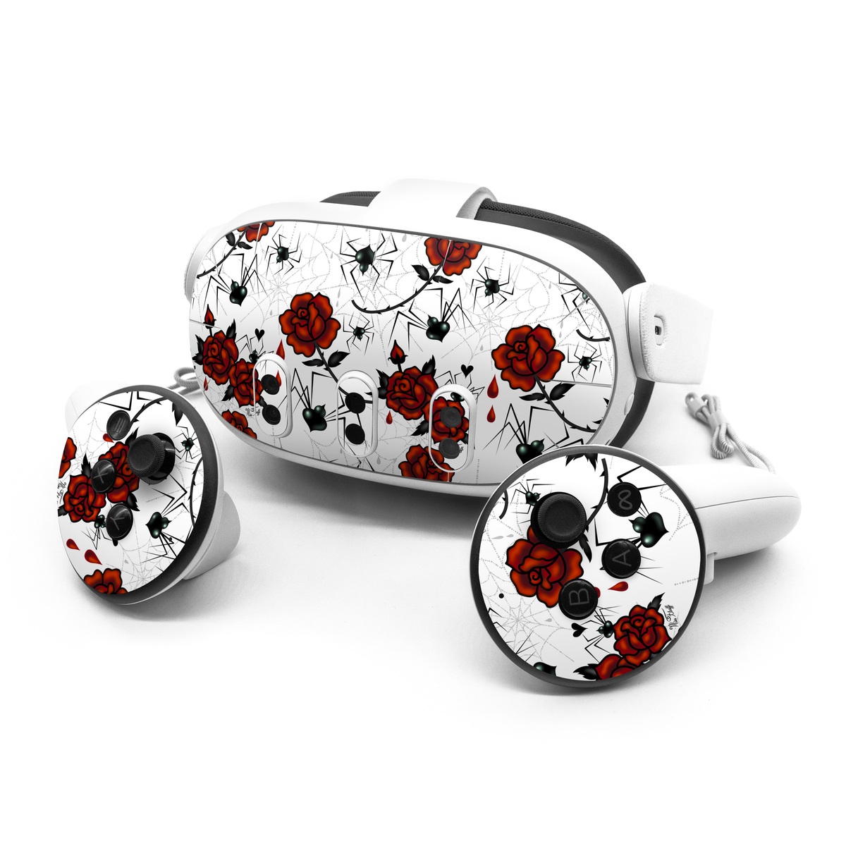 iStyles Meta Quest 3 Series Skin design of Red, Pattern, Flower, Plant, Design, Floral design, Petal, Coquelicot, Wildflower, Rose, with black, white, red colors, and tagged with animals, flowers, blackwidows, #halloween, roses, spiderwebs, spiders, spooky, tattoo.