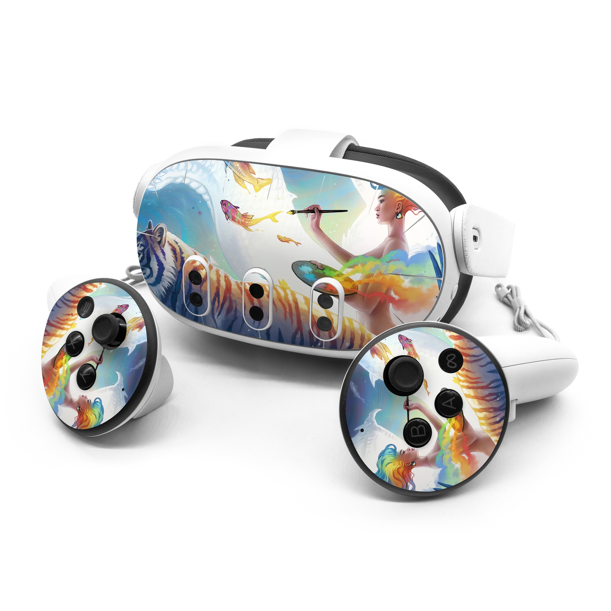 iStyles Meta Quest 3 Series Skin design of Siberian tiger, Bengal tiger, Vertebrate, Tiger, Felidae, Mammal, Water, Carnivore, Art, Painting, with blue, red, yellow, orange, green, purple, black, white colors, and tagged with animals, people, objects, fantasy, artist, artistic, creative, fish, koi, paint, parrot, rainbow, woman.