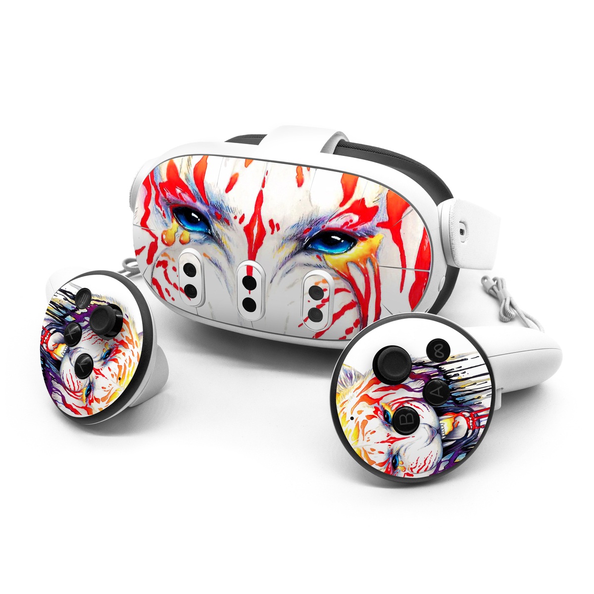 iStyles Meta Quest 3 Series Skin design of Jaw, Roar, Organism, Gesture, Art, Font, Felidae, Painting, Illustration, Drawing, with white, black, yellow, red, orange, purple colors, and tagged with animals, paint, rainbow, tiger.