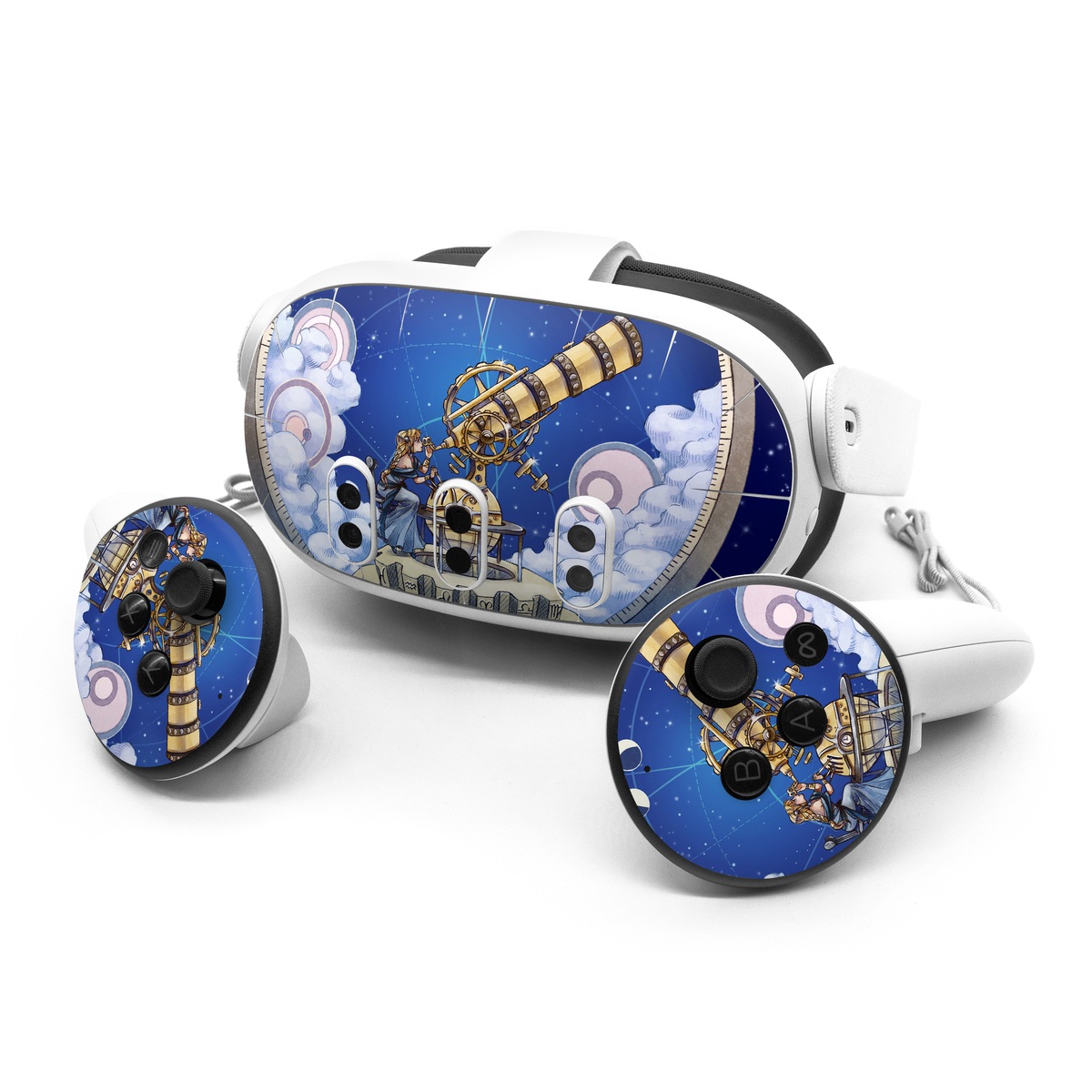 iStyles Meta Quest 3 Series Skin design of Circle, World, Space, Vehicle, Satellite, Illustration, with white, blue, yellow, pink, gray colors, and tagged with people, objects, space, astrology, microscope, outerspace, space, stars.