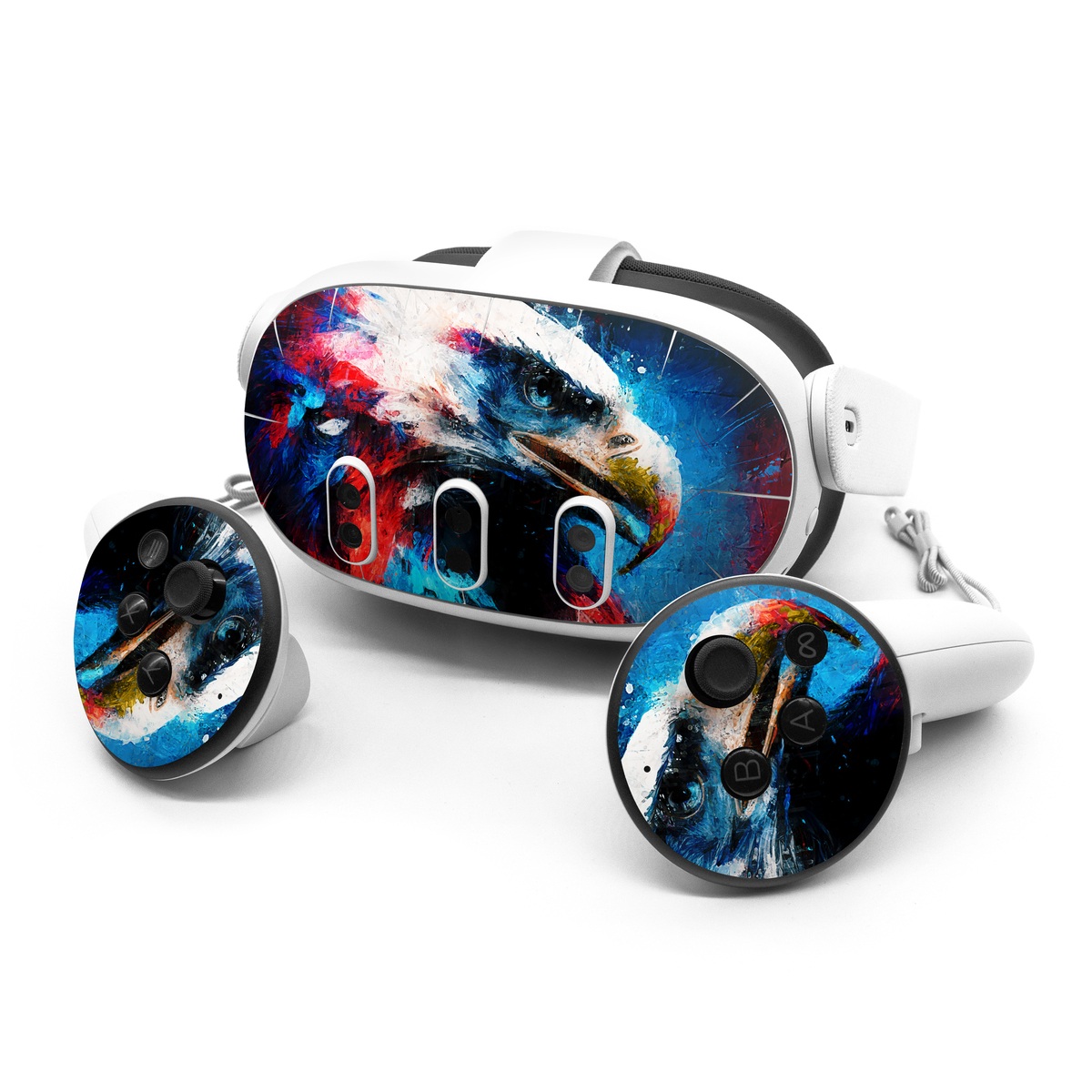 iStyles Meta Quest 3 Series Skin design of Bird, Beak, Organism, Art, Feather, Paint, Painting, Accipitridae, Bird of prey, Electric blue, with blue, red, white, black, gray, yellow colors, and tagged with animals, america, usa.