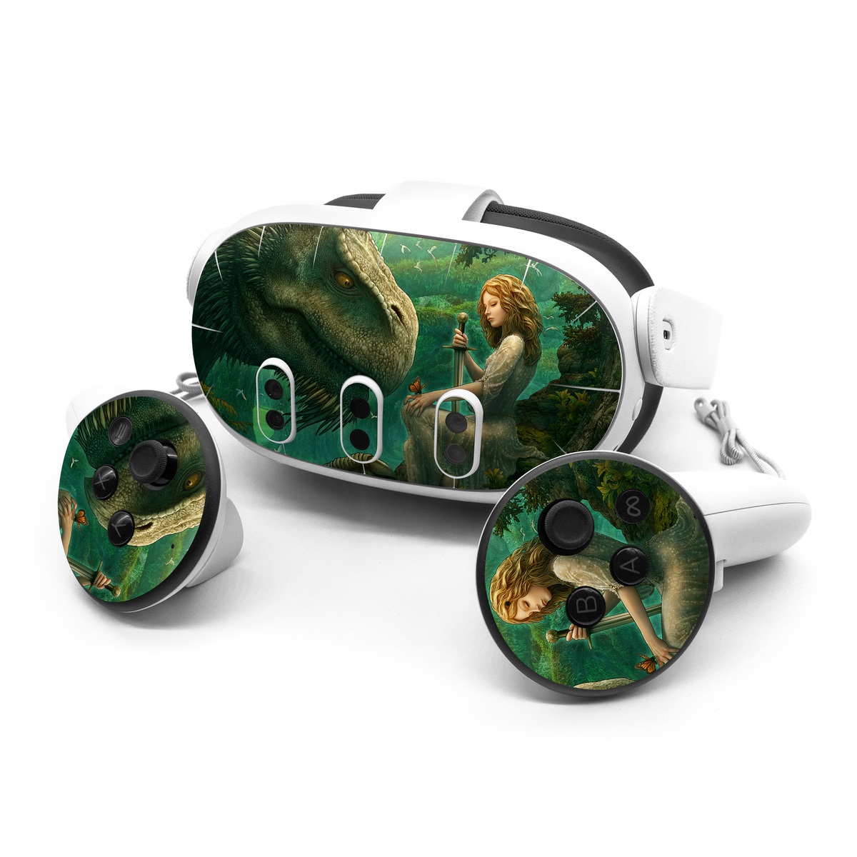 iStyles Meta Quest 3 Series Skin design of Dinosaur, Cg artwork, Mythology, Fictional character, Troodon, Extinction, Velociraptor, Illustration, Animated cartoon, Tyrannosaurus, with black, green, gray, red colors, and tagged with animals, people, nature, fantasy, objects.