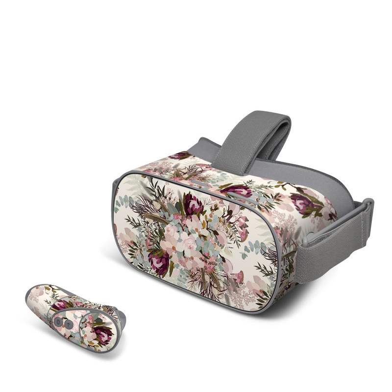 iStyles Oculus Go Skin design of Pink, Pattern, Lilac, Flower, Plant, Petal, Floral design, Textile, Design, Blossom, with white, red, pink, blue, brown colors, and tagged with patterns, flowers, nature, bouquet, filigree, floral, flower, flowers, pastel.