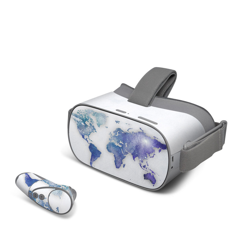 iStyles Oculus Go Skin design of World, Map, Watercolor paint, Illustration, with white, blue, purple colors, and tagged with maps, globe, map, pastel, travel, watercolor, world.