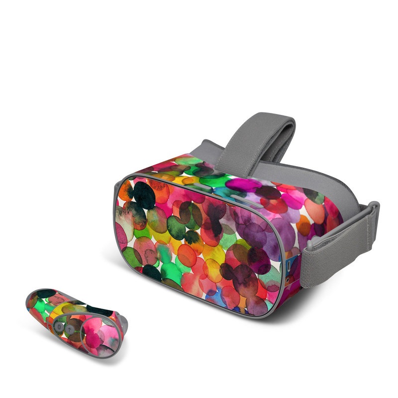 iStyles Oculus Go Skin design of Colorfulness, Fashion accessory, with red, white, pink, purple, blue, green, black, yellow, orange colors, and tagged with patterns, abstract, bright, colorful, dots, drops, vivid, watercolor.