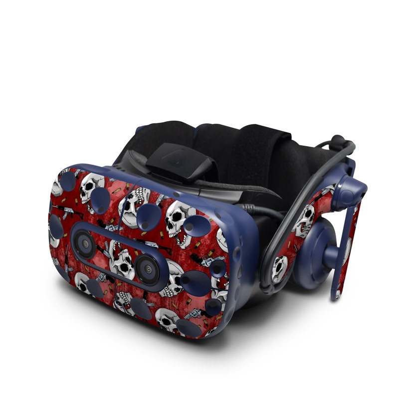 iStyles HTC VIVE Pro Skin design of Skull, Red, Bone, Personal protective equipment, Skeleton, Mask, Font, Sports gear, Headgear, Pattern, with black, red, gray colors, and tagged with patterns, skulls, objects.
