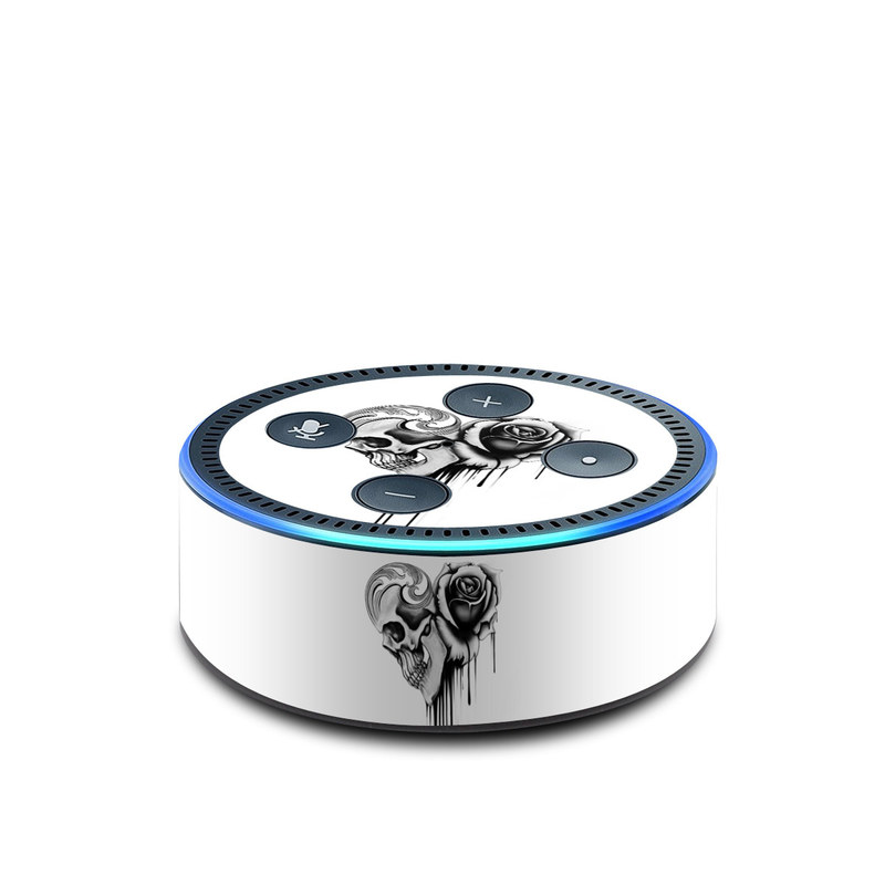 iStyles Amazon Echo Dot 2nd Gen Skin design of Black-and-white, Illustration, Monochrome, Rose, Plant, Style, Metal, Drawing, with white, black, gray colors, and tagged with hearts, flowers, skulls, goth, gothic, heart, ink, inkpen, rose, sketch, skull.