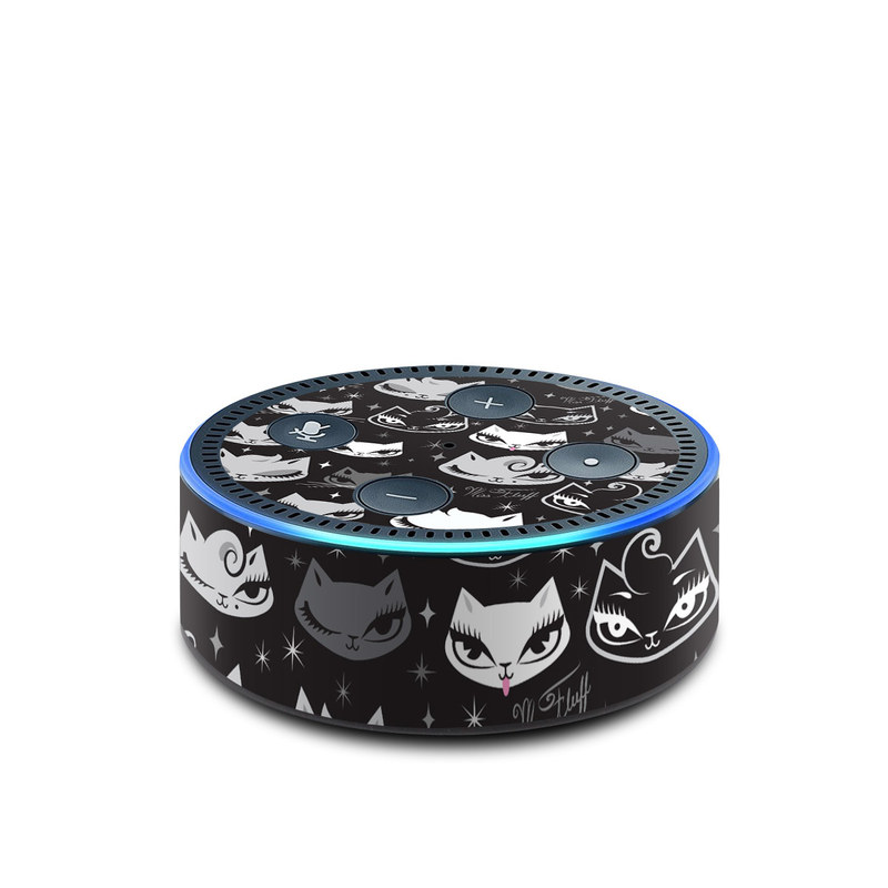 iStyles Amazon Echo Dot 2nd Gen Skin design of Pattern, Design, Headgear, Hat, Smile, Team, Crowd, with black, white, gray colors, and tagged with patterns, animals, blackandwhite, cartoon, Cat, cats, kitten, pattern.