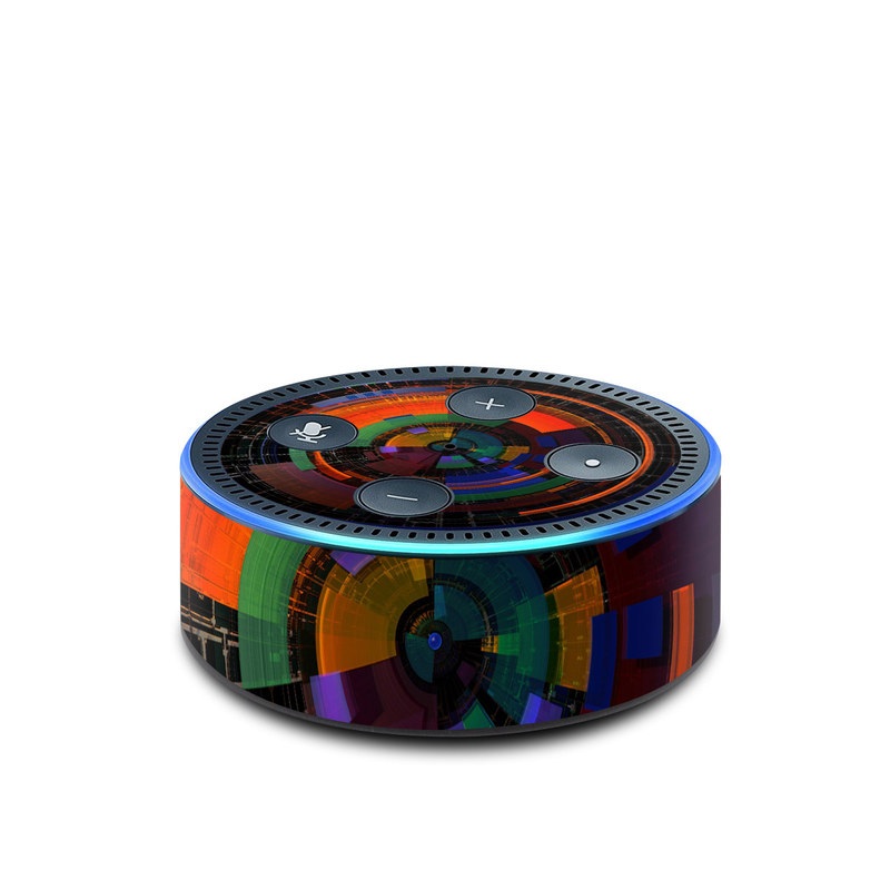 iStyles Amazon Echo Dot 2nd Gen Skin design of Colorfulness, Pattern, Circle, Design, Architecture, Symmetry, Art, Spiral, Psychedelic art, with black, red, blue, green, orange, brown colors, and tagged with abstract, patterns.