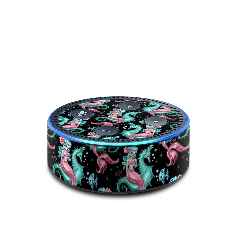 iStyles Amazon Echo Dot 2nd Gen Skin design of Pink, Pattern, Illustration, Organism, Design, Art, Textile, Visual arts, Graphic design, Fictional character, with black, green, pink, yellow colors, and tagged with fantasy, animals, flowers, beach, fish, glamor, mermaids, pinup, seahorses.