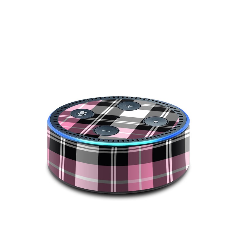 iStyles Amazon Echo Dot 2nd Gen Skin design of Plaid, Tartan, Pattern, Pink, Purple, Violet, Line, Textile, Magenta, Design, with black, gray, pink, red, white, purple colors, and tagged with patterns.