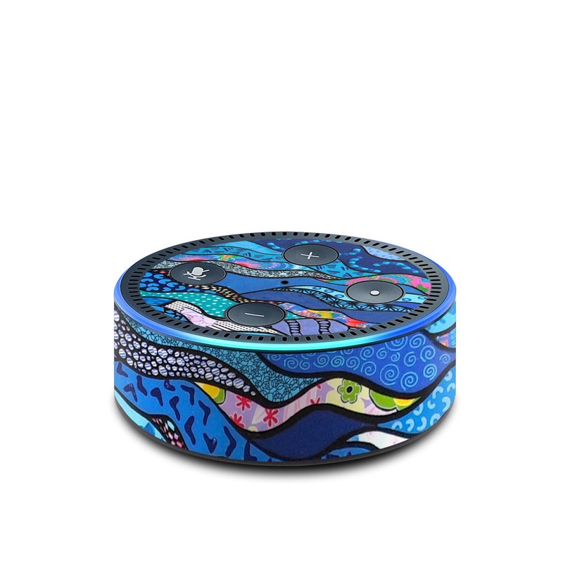 iStyles Amazon Echo Dot 2nd Gen Skin design of Blue, Pattern, Aqua, Water, Line, Design, Textile, Psychedelic art, Electric blue, with blue, black, gray, purple colors, and tagged with abstract, flowers.