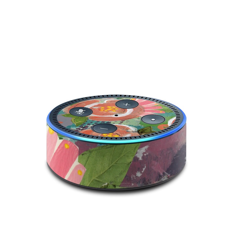 iStyles Amazon Echo Dot 2nd Gen Skin design of Painting, Watercolor paint, Still life, Child art, Art, Illustration, Acrylic paint, Flower, Visual arts, Textile, with green, pink, red, yellow, blue, white, black, gray colors, and tagged with flowers, abstract, bright, flowers, nature, paint.