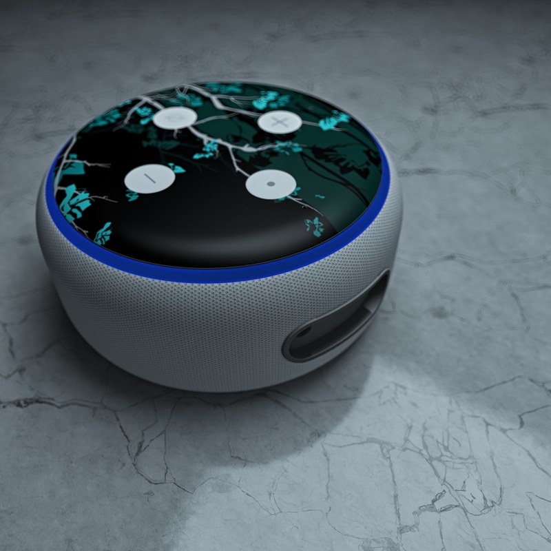 iStyles Amazon Echo Dot 3rd Gen Skin design of Branch, Black, Blue, Green, Turquoise, Teal, Tree, Plant, Graphic design, Twig, with black, blue, gray colors, and tagged with flowers.