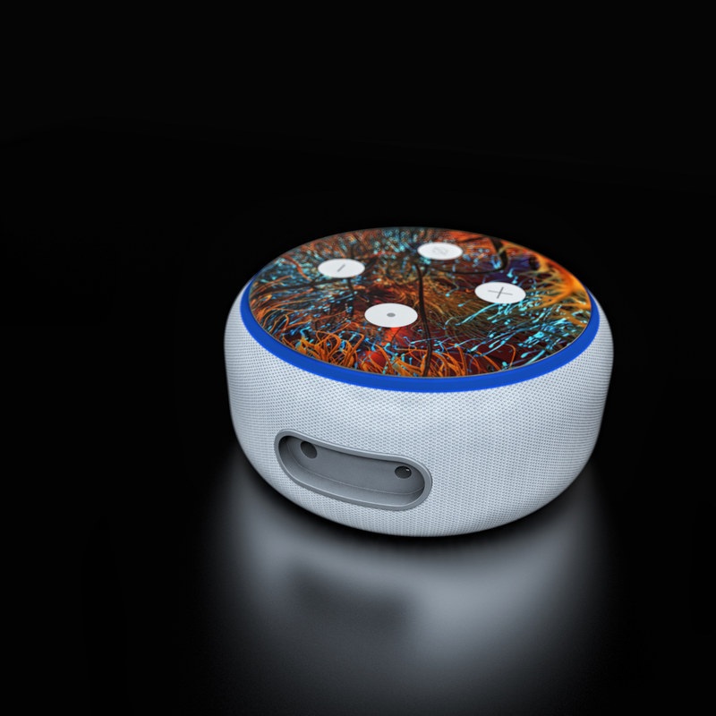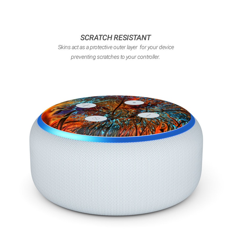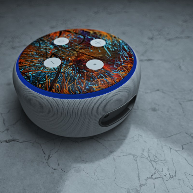 iStyles Amazon Echo Dot 3rd Gen Skin design of Orange, Tree, Electric blue, Organism, Fractal art, Plant, Art, Graphics, Space, Psychedelic art, with orange, blue, red, yellow, purple colors, and tagged with patterns.