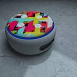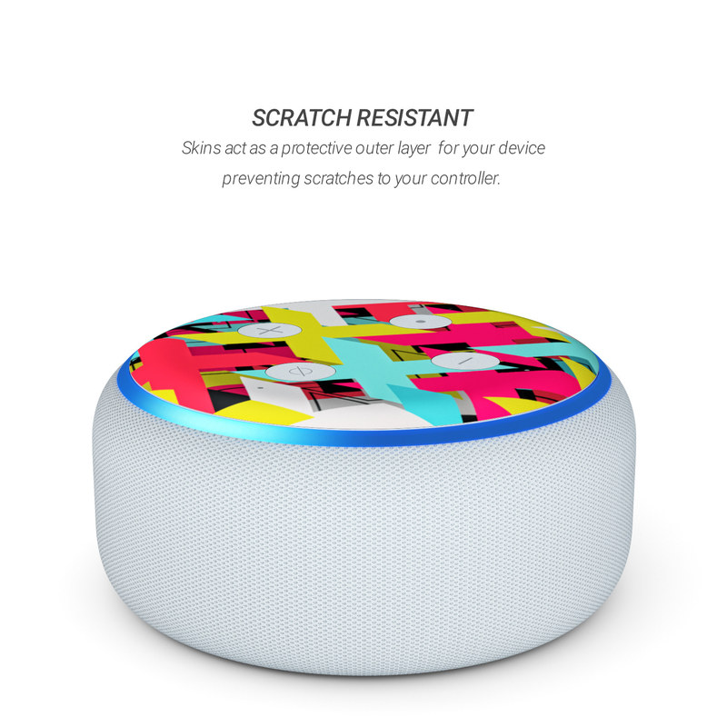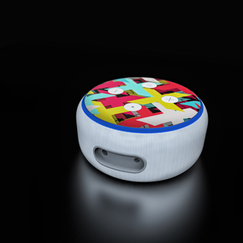 iStyles Amazon Echo Dot 3rd Gen Skin design of Pattern, Graphic design, Line, Design, Triangle, Font, Illustration, Magenta, Visual arts, with yellow, blue, white, black, red, pink colors, and tagged with patterns, signs.